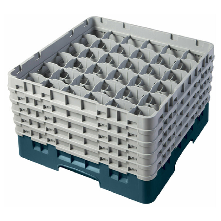 The Cambro 36S958414 Camrack® Glass Rack with (5) soft gray extenders is a full-size solution measuring 19-3/4" x 19-3/4" x 12-1/8", specifically designed to accommodate a variety of glassware efficiently. With 36 individual compartments, it securely holds glass items with a maximum diameter of 2-7/8" and a maximum height of 10-1/8", providing ample space while ensuring protection. Crafted in a distinctive teal color, this glass rack is both HACCP compliant and NSF certified, ensuring it meets stringent public health and safety standards, making it an ideal choice for the food service industry. The inclusion of five soft gray extenders enhances its flexibility, allowing it to adjust to different glass heights, which is particularly useful for bars, restaurants, and catering services. This rack is engineered to streamline operations by minimizing breakage and facilitating efficient washing, transportation, and storage of glassware. Its robust design ensures longevity and reliability in high-volume environments, catering to the needs of diverse market segments such as hospitality, event management, and institutional catering. The Cambro 36S958414 Camrack® Glass Rack exemplifies practicality and efficiency, serving as an essential tool for maintaining glassware integrity while optimizing operational workflows.