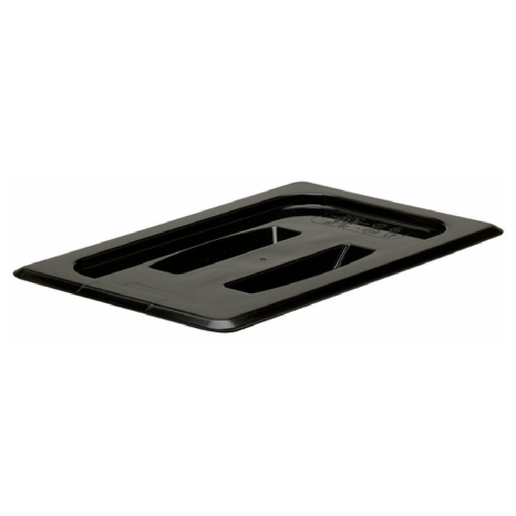 The Cambro 40CWCH110 Camwear® Food Pan Cover 1/4 Size With Handle is a specialized kitchen accessory designed to enhance operational efficiency in various food service environments. Crafted from durable polycarbonate, this cover ensures long-lasting performance and resilience against impact, making it an ideal choice for both commercial kitchens and catering services. The black color provides a sleek and professional appearance, easily integrating with existing kitchenware. The inclusion of a handle adds convenience, allowing for easy removal and handling, which is especially beneficial in high-paced kitchen settings where time and efficiency are paramount. This cover is specifically designed to fit 1/4 size food pans, optimizing storage and safeguarding contents from contaminants. As an NSF certified product, it meets rigorous public health standards, ensuring safety and hygiene are maintained. This makes the Cambro 40CWCH110 an invaluable tool for restaurants, cafeterias, and food preparation areas that prioritize quality and compliance with health regulations. Its robust construction and ease of use make it a practical solution for protecting and maintaining the freshness of food items during storage and service.