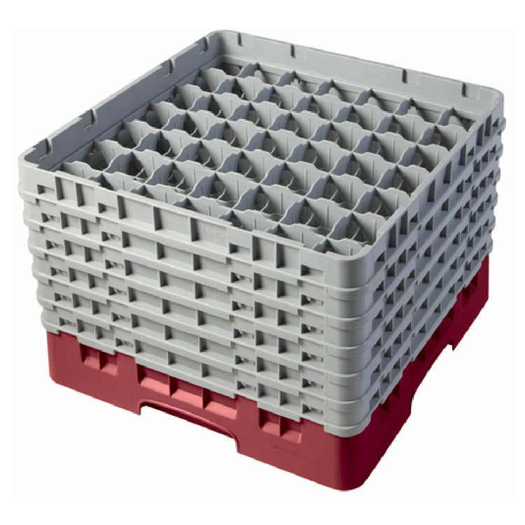 The Cambro 49S1114416 Camrack® Glass Rack with (6) soft gray extenders is a full-size rack meticulously designed for optimal glassware management in industrial kitchens and catering services. Measuring 19-3/4" x 19-3/4" x 13-3/4", this rack is engineered to accommodate up to 49 compartments, each supporting a maximum glass diameter of 2-7/16" and a height of 11-3/4". This robust structure ensures that a wide variety of glass types can be securely transported and stored without the risk of damage. The inclusion of soft gray extenders enhances the rack's flexibility, allowing it to cater to glassware of varying heights, which is critical for diverse hospitality environments. Finished in a distinctive cranberry color, the Camrack® is not only visually appealing but also complies with HACCP standards, affirming its role in maintaining high sanitary conditions. It is also NSF certified, underscoring its adherence to strict public health and safety regulations. This glass rack is indispensable for restaurants, hotels, and event venues that prioritize efficient organization and storage of glassware, offering a unique combination of durability, functionality, and compliance with industry standards.