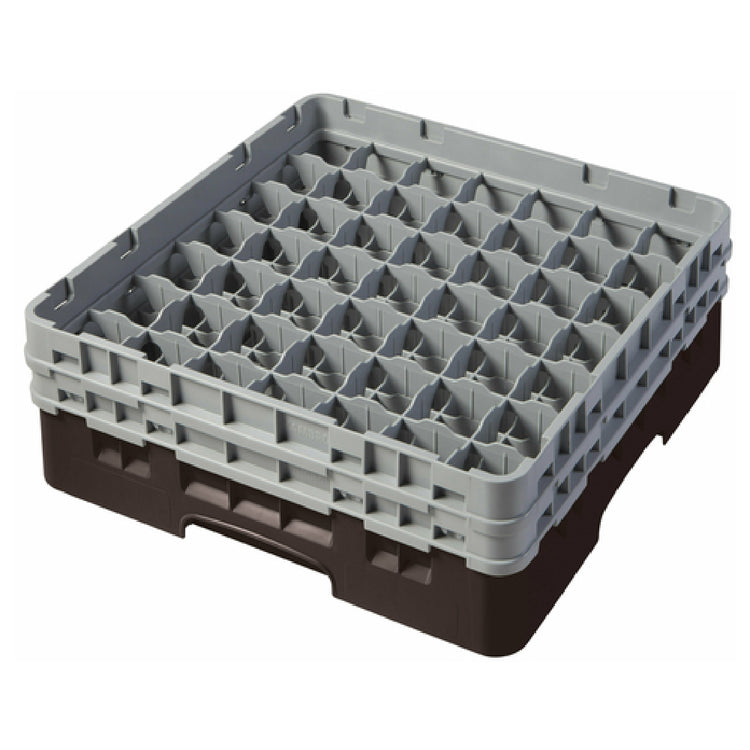 The Cambro 49S434167 Camrack® Glass Rack With (2) Soft Gray Extenders Full Size is a meticulously engineered storage solution tailored for the hospitality and food service industry. Measuring 19-3/4" x 19-3/4" x 7-1/4", it accommodates up to 49 individual compartments, each with a maximum diameter of 2-7/16" and a maximum height of 5-1/4". This design is particularly beneficial for establishments requiring organized and safe handling of glassware. The full-size rack features two soft gray extenders, enhancing its capacity and adaptability to different glass sizes. Its HACCP compliance ensures that the rack aligns with food safety management protocols, making it a suitable choice for maintaining hygiene standards. The brown coloration is both functional and stylish, easily integrating into the aesthetics of various kitchen environments. This Camrack® Glass Rack is also NSF certified, affirming its adherence to strict public health and safety standards. Ideal for restaurants, bars, and catering services, it provides a reliable and efficient means of glassware storage and transport, minimizing breakage and ensuring a streamlined service operation.