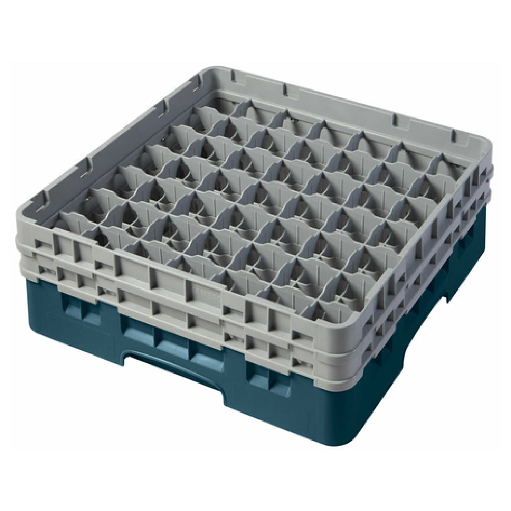 The Cambro 49S434414 Camrack® Glass Rack with (2) Soft Gray Extenders Full Size is a meticulously designed storage solution tailored for the hospitality and food service industries. This full-size glass rack measures 19-3/4" x 19-3/4" x 7-1/4" and features 49 individual compartments, each accommodating a maximum diameter of 2-7/16" and a height of up to 5-1/4". The inclusion of two soft gray extenders provides additional flexibility and capacity, catering to various glass sizes and shapes. The rack's teal color makes it easily identifiable, enhancing operational efficiency in bustling kitchen environments. Constructed in compliance with HACCP and NSF standards, this glass rack underscores its commitment to safety and hygiene, making it an ideal choice for establishments prioritizing these aspects. Its design not only ensures the secure transport of glassware but also simplifies the cleaning process. By integrating these functional and practical features, the Cambro 49S434414 Camrack® Glass Rack is a durable and reliable asset for restaurants, bars, and catering services seeking to streamline their glassware management and enhance their service quality. This product harmonizes functionality with compliance, making it a must-have for professionals in the industry looking to optimize their glassware storage solutions.