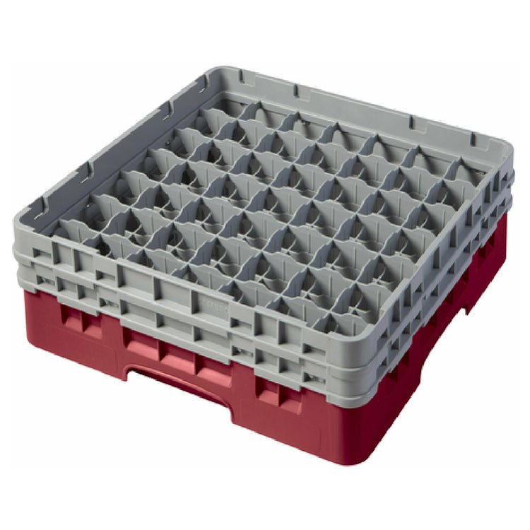 The Cambro 49S434416 Camrack® Glass Rack With (2) Soft Gray Extenders Full Size is a meticulously designed solution for safe glassware storage and transportation. This full-size rack, measuring 19-3/4" x 19-3/4" x 7-1/4", is equipped with 49 individual compartments, each accommodating a maximum diameter of 2-7/16" and a height of up to 5-1/4". The inclusion of two soft gray extenders enhances its capacity, ensuring versatile usage across various glass sizes. Constructed in a striking cranberry color, this glass rack is both HACCP compliant and NSF certified, aligning with rigorous food safety and hygiene standards. The Cambro Camrack® is an essential tool for a range of industries, from hospitality to healthcare, where efficient and secure glassware handling is paramount. Its robust design and compliance credentials make it a reliable choice for maintaining glassware integrity during storage and transport, catering to the needs of restaurants, hotels, and catering services looking for dependable equipment solutions. This product's emphasis on durability and hygiene underscores its value in professional settings, making it a strategic addition to any operation prioritizing safety and efficiency in glassware management.