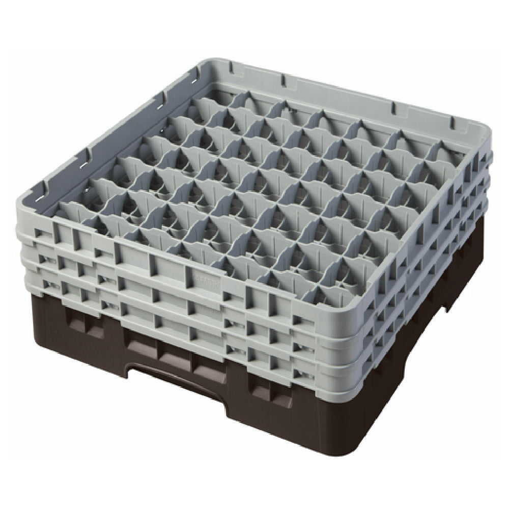 The Cambro 49S638167 Camrack® Glass Rack With (3) Soft Gray Extenders Full Size is a meticulously designed product tailored for efficient glassware organization and storage solutions within the foodservice industry. Featuring a robust full-size dimension of 19-3/4" x 19-3/4" x 8-7/8", this glass rack is engineered to accommodate an impressive 49 compartments. Each compartment supports a maximum diameter of 2-7/16" and a maximum height of 6-7/8", ensuring secure and stable storage for various glass sizes. The inclusion of three soft gray extenders enhances its functionality, allowing for optimal glass protection and stacking versatility. Finished in an earthy brown color, the rack aligns with HACCP compliance, underscoring its commitment to meeting high food safety standards. Additionally, it is NSF certified, assuring users of its adherence to rigorous public health and safety guidelines. This Cambro glass rack is the epitome of reliability and efficiency, making it an invaluable asset for restaurants, catering events, and hospitality venues that demand high standards of hygiene and organization in their operations.