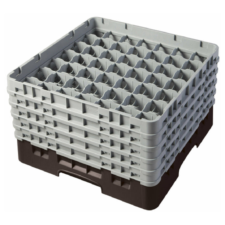The Cambro 49S958167 Camrack® Glass Rack with (5) Soft Gray Extenders Full Size is a meticulously designed storage solution, ideal for a variety of foodservice and hospitality environments. Measuring 19-3/4" x 19-3/4" x 12-1/8", this glass rack is structured to accommodate up to 49 compartments, each with a maximum diameter of 2-7/16" and a maximum height of 10-1/8". This functional design provides ample space for glassware, ensuring their safety and cleanliness during transport and storage. The inclusion of five soft gray extenders allows for customizable height adjustments, catering to various glass sizes and shapes. Its robust construction is complemented by a brown finish, enhancing its durability and aesthetic appeal. Additionally, the rack's compliance with HACCP standards and NSF certification underscores its commitment to meeting health and safety regulations, making it a dependable choice for establishments prioritizing hygiene and efficiency. This glass rack caters to different segment markets, including catering services, restaurants, and banquet facilities, providing them with a reliable and versatile equipment piece that enhances operational efficiency while maintaining stringent cleanliness standards.