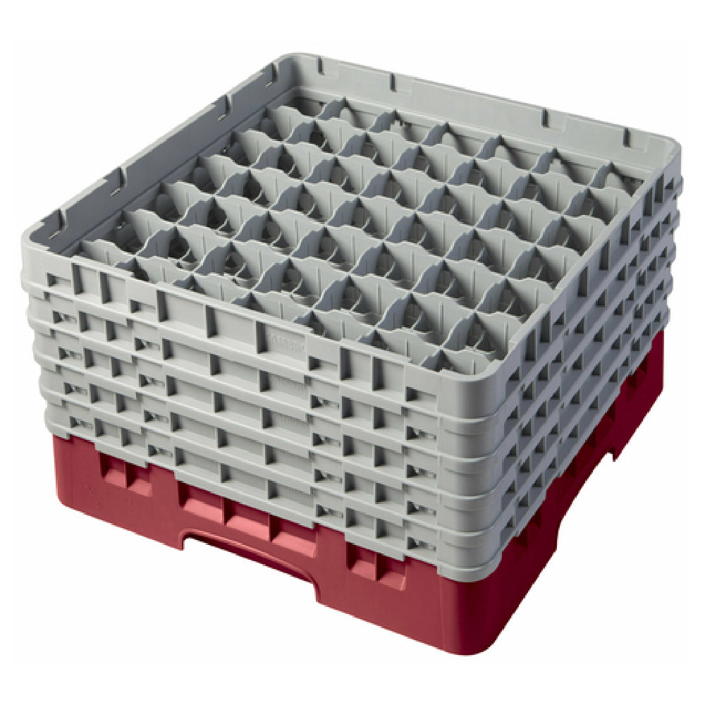 The Cambro 49S958416 Camrack® Glass Rack With (5) Soft Gray Extenders Full Size is a high-capacity solution tailored for the hospitality and catering industries. Measuring 19-3/4" x 19-3/4" x 12-1/8", this full-size glass rack is designed to accommodate a variety of glassware with its 49 compartments, each supporting a maximum diameter of 2-7/16" and a height of up to 10-1/8". The inclusion of five soft gray extenders enhances its versatility, allowing for secure stacking and optimal use of space in busy kitchen environments. The rack's cranberry finish not only adds a touch of vibrancy but also serves as an indicator of its functionality within the HACCP system, ensuring it meets stringent food safety standards. The Camrack® Glass Rack is NSF certified, further underscoring its compliance with industry regulations and its suitability for maintaining high hygiene standards. Engineered for durability and efficiency, this product is an indispensable asset for establishments ranging from restaurants and hotels to large event venues, offering streamlined glassware management and protection during washing and storage processes.