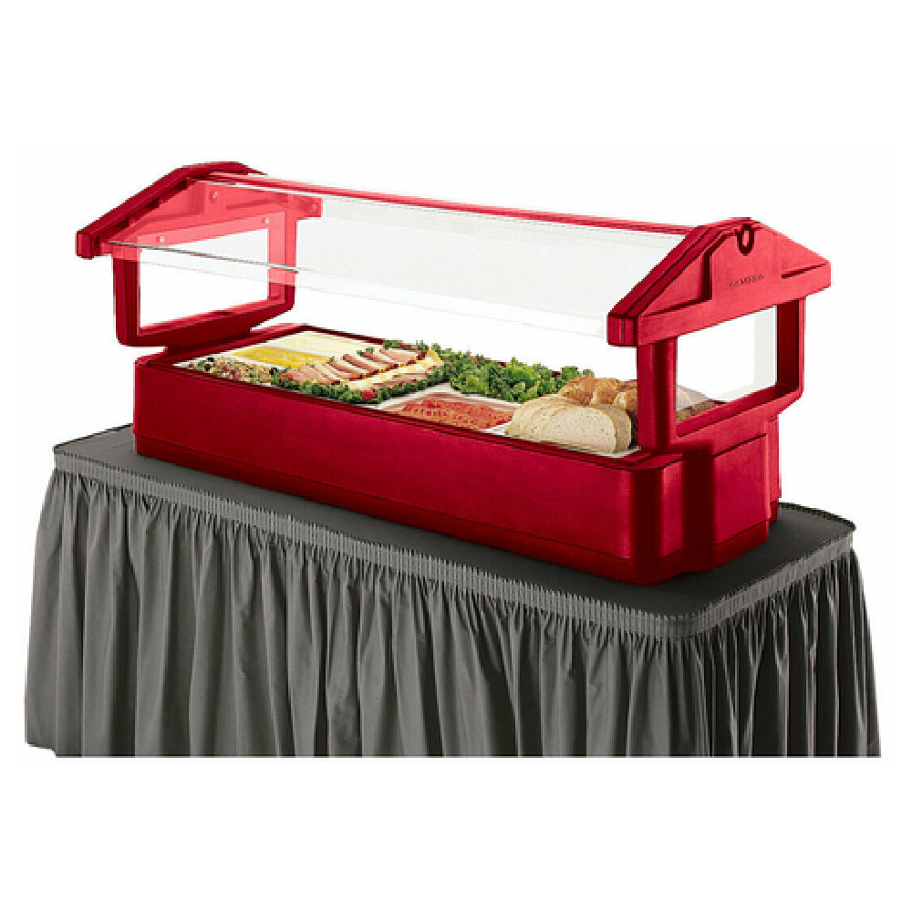 The Cambro 4FBRTT158 Table Top Food Bar is a versatile solution for various food service environments, measuring 51 inches in length, 33-1/4 inches in width, and 27 inches in height. This table-top food bar is equipped with an iced cold pan and accommodates a 3-pan size, providing ample space for chilled food storage. It features a sneeze guard, ensuring hygiene and safety in high-traffic areas. Constructed with double-wall polyethylene, this unit is non-electrical, making it suitable for settings without access to electrical outlets. Finished in hot red, it adds a vibrant touch to any food service presentation while maintaining its durability. The Cambro 4FBRTT158 is NSF certified, guaranteeing it meets rigorous public health and safety standards. Its design makes it ideal for catering events, buffets, or food displays, offering a reliable and visually appealing option for keeping food items at the desired temperature. This food bar combines practicality with style, making it a valuable addition to any food service establishment looking to enhance its serving capabilities while ensuring compliance with industry standards.
