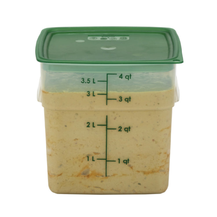 The Cambro 4SFSPROPP190 CamSquare® FreshPro Food Container is a versatile and practical solution for food storage needs across various segments of the food service industry. With a capacity of 4 quarts, it is designed with dimensions of 7.5 inches in length, 7.5 inches in width, and 7.2 inches in height, providing ample space for a variety of food items. This container features green graduation marks for precise measurement, enhancing its utility in professional kitchens where accuracy is key. Made from durable polypropylene, it is both dishwasher safe and resistant to stains and odors, ensuring longevity and ease of maintenance. The translucent design allows for easy identification of contents without having to open the container, streamlining kitchen operations. Furthermore, it is NSF certified, signifying compliance with high standards of safety and sanitation, which is critical for establishments committed to maintaining top-notch hygiene practices. The Cambro 4SFSPROPP190 is especially suited for use in catering, restaurant, and institutional settings, where reliable, high-quality food storage solutions are essential for efficient and effective food management. This container is a functional choice for those seeking durable and reliable storage options that meet rigorous industry standards.
