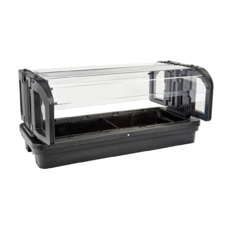 Cambro, 5TTFSBSG110, Versa Food Bar with Sneeze Guard, 63-1/2"W x 39"D x 29"H, table top, (4) GN 1/1 4" pan capacity, double-wall polyethylene, foam-injected polyurethane insulation, deep wells for 21/2", 4", 6" pans, compatible with DIV12/DIV20 divider bars, buffet camchiller, well cover, ColdFest pans, salad bowl holders (SBH15/SBH18), crock holder (CPH3), integrated drain shelf and drain valve, fits 4-6 ft tables, passes through doorways, removable flip-up sneeze guards with protective end panels, textured exterior, black standard, NSF
