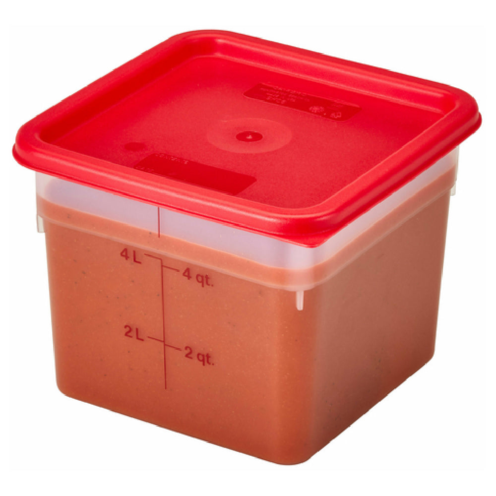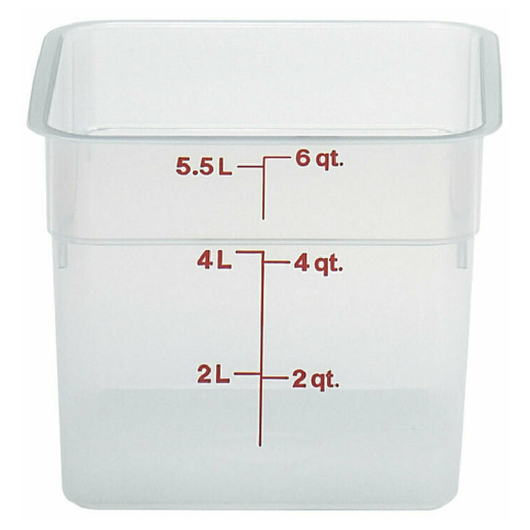 The Cambro 6SFSPP190 CamSquare® Food Container 6 Qt. 8-3/8"L x 8-3/8"W x 7-1/4"H is a versatile storage solution designed for both commercial and personal use. With a capacity of 6 quarts, it is ideal for storing a variety of food items, ensuring they remain fresh and uncontaminated. Measuring 8-3/8 inches in length and width, and 7-1/4 inches in height, this container offers ample storage while being compact enough to fit in refrigerators and shelving units. Made from durable polypropylene, it is resistant to stains and odors, providing longevity and reliability in demanding kitchen environments. The container is translucent, allowing for easy identification of contents, which is further facilitated by the red graduation markings. These markings are useful for precise measurements, catering to the needs of professional chefs and home cooks alike. It is also dishwasher safe, making cleaning effortless and ensuring high standards of hygiene are maintained. Certified by NSF, the Cambro 6SFSPP190 meets stringent public health and safety standards, making it a trusted choice for food storage. This container's practical design and robust construction make it an essential tool in any foodservice operation, supporting efficiency and quality in food handling and storage.