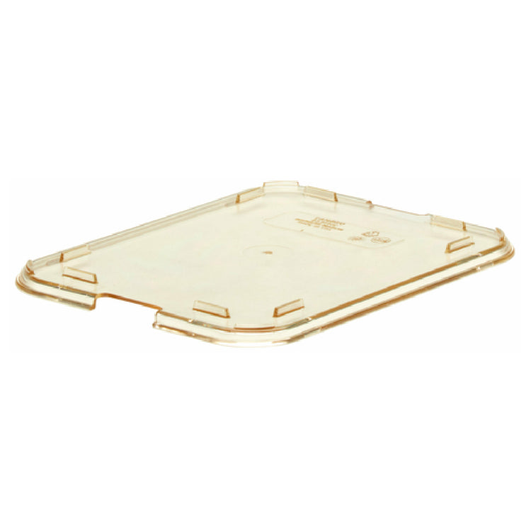 The Cambro 853FHC150 Lid is a precisely crafted component measuring 8-13/16 inches in length, 6-3/4 inches in width, and 1/4 inch in depth, designed specifically for compatibility with the 853FH container. This lid is constructed from heat-resistant amber plastic, making it an ideal choice for environments requiring durability and temperature resilience. Its amber hue not only adds a distinctive aesthetic but also serves functional purposes in terms of visibility and safety. The lid is NSF certified, meeting rigorous standards for public health protection, which is crucial for industries such as food service where hygiene and safety are top priorities. The Cambro 853FHC150 is valued across different market segments including commercial kitchens, catering services, and food processing facilities, all of which benefit from its reliable performance and adherence to stringent health guidelines. Its specific dimensions and robust construction ensure a secure fit and prolonged usage, highlighting its role as an essential accessory in maintaining product integrity and operational efficiency within professional settings.