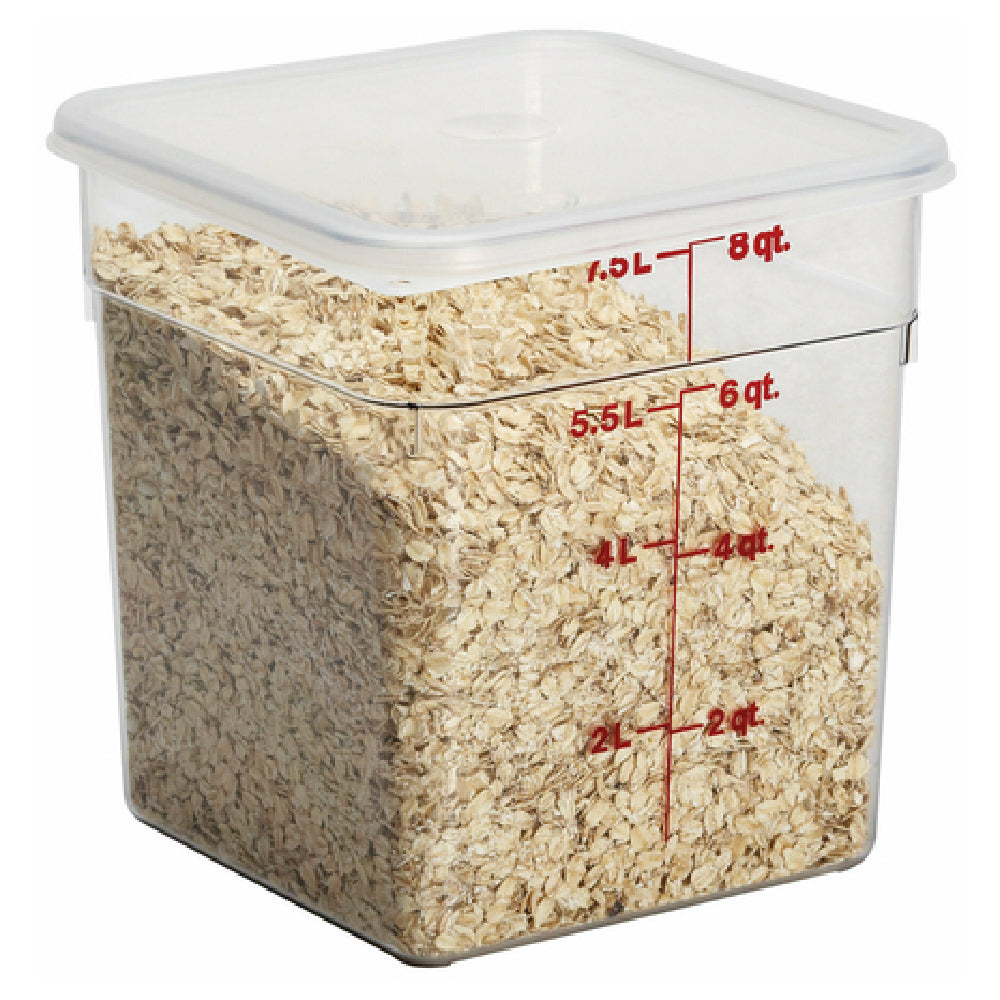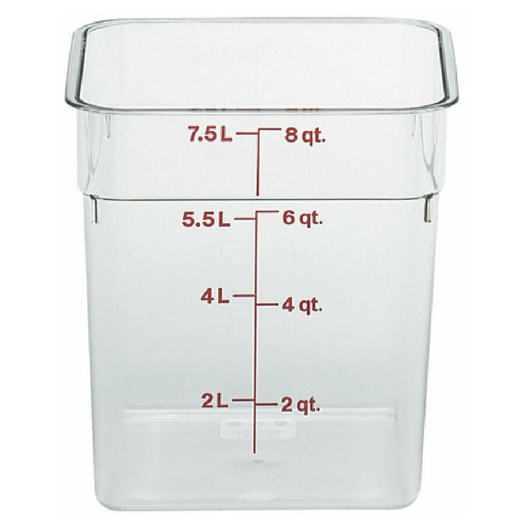 The Cambro 8SFSCW135 CamSquare® Food Container is a versatile 8-quart storage solution designed for efficient kitchen operations. With dimensions of 8-3/8 inches in length and width and a height of 9-1/8 inches, this container is compact yet spacious enough to accommodate various storage needs. Crafted from durable polycarbonate, it offers excellent resistance to stains and odors, ensuring a hygienic environment for food storage. The clear design allows for easy visibility of contents, while the red graduation markings facilitate precise measurement, making it an ideal choice for busy kitchen environments where accuracy is paramount. Dishwasher safe, the Cambro 8SFSCW135 is easy to clean, further enhancing its practicality in fast-paced settings. Its NSF certification underscores its adherence to stringent safety and quality standards, making it suitable for commercial use. This container is perfect for food service professionals seeking reliable storage solutions that prioritize durability and efficiency, catering to a wide range of market segments within the food industry.