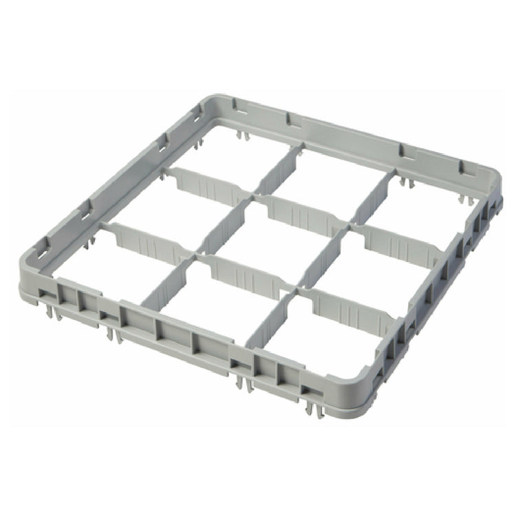 The Cambro 9E2151 Half Drop Extender Full Size is a meticulously designed accessory for enhancing the functionality of Camracks. With its dimensions of 19-5/8" x 19-5/8" x 2", this extender efficiently increases the rack height by 1-5/8", providing additional vertical space to accommodate various glassware or dishware needs. The unit is composed of nine compartments, offering a structured layout to ensure organized and secure storage. Its soft gray color adds a subtle aesthetic appeal while seamlessly blending into diverse kitchen environments. The Cambro 9E2151 is particularly beneficial for establishments such as restaurants, hotels, and catering services, where maximizing space and maintaining organization are of paramount importance. This extender not only optimizes space but also enhances the durability of the rack, making it a valuable investment for businesses seeking to improve operational efficiency and protect their kitchenware. By combining practical dimensions and a robust compartmental layout, the Cambro 9E2151 Half Drop Extender is an indispensable addition for those in the hospitality industry looking to elevate their storage solutions.