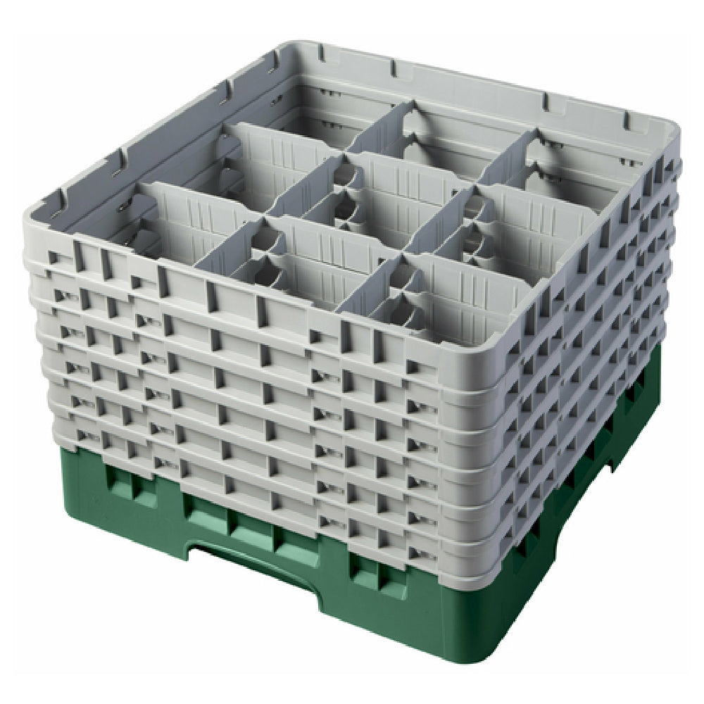 The Cambro 9S1114119 Camrack® Glass Rack with (6) soft gray extenders is a full-size solution designed for efficient and safe glassware storage in professional settings. Measuring 19-3/4" x 19-3/4" x 13-3/4", this glass rack offers nine compartments, each accommodating a maximum diameter of 5-7/8" and a maximum height of 11-3/4". Its robust construction and Sherwood green finish make it a practical choice for hospitality and catering environments. With its HACCP compliance, the Camrack® Glass Rack ensures adherence to food safety standards, while the NSF certification highlights its reliability and quality for use in commercial kitchens. This product's unique value lies in its capacity to safeguard glassware during wash cycles and transportation, making it indispensable for restaurants, hotels, and event facilities aiming to maintain high standards of glassware presentation and hygiene. The soft gray extenders provide additional flexibility, allowing the rack to accommodate larger glassware without compromising on protection or organization. The Cambro 9S1114119 Camrack® Glass Rack stands out as a vital asset in maintaining efficiency and safety in glassware management, ideal for operations that demand both durability and performance in their glassware handling solutions.
