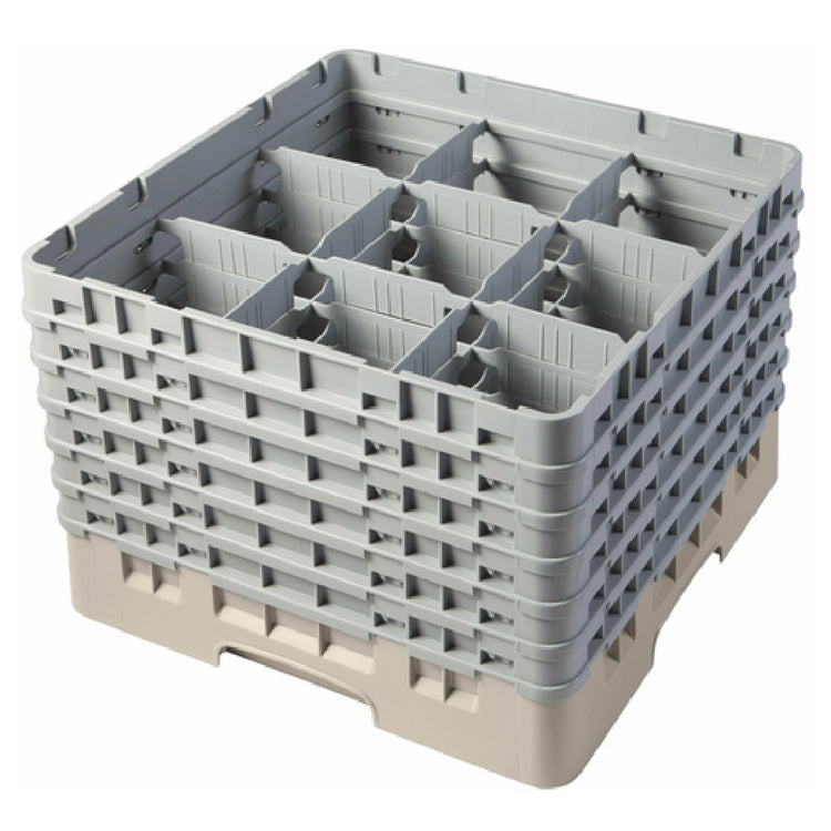 The Cambro 9S1114184 Camrack® Glass Rack With (6) Soft Gray Extenders Full Size is an efficient solution for safely organizing and transporting glassware in various foodservice environments. Measuring 19-3/4" x 19-3/4" x 13-3/4", this full-size rack is designed with (9) compartments, each capable of holding glasses with a maximum diameter of 5-7/8" and a maximum height of 11-3/4". The inclusion of (6) soft gray extenders enables the accommodation of taller glassware while ensuring secure stacking during transportation. Its beige color not only enhances its aesthetic appeal but also complements diverse kitchen decors. This rack's design is compliant with HACCP standards, making it a reliable choice for maintaining hygiene and safety in foodservice operations. Additionally, it is NSF certified, underscoring its commitment to meeting public health protection standards. The Cambro 9S1114184 Camrack® Glass Rack is an essential asset across different segments such as restaurants, hotels, and catering companies, providing a robust and hygienic solution for glassware management. Its durable construction and compliance with industry standards make it an indispensable tool for optimizing operational efficiency and ensuring the safety of glassware in busy commercial kitchens.