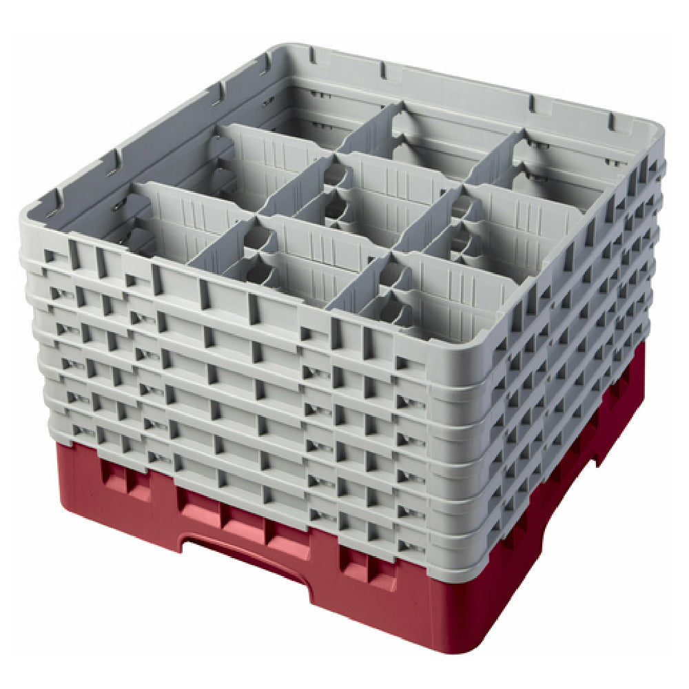 The Cambro 9S1114416 Camrack® Glass Rack With (6) Soft Gray Extenders Full Size is a meticulously designed storage solution ideal for diverse segments within the hospitality and food service industries. Measuring 19-3/4 inches by 19-3/4 inches by 13-3/4 inches, it provides a robust framework for organizing and transporting glassware. This full-size rack includes six soft gray extenders, accommodating varying glass heights up to a maximum of 11-3/4 inches, and is structured into nine compartments, each allowing for a maximum diameter of 5-7/8 inches. The cranberry color adds a distinctive aesthetic, while the HACCP compliance ensures it meets stringent food safety standards, essential for maintaining hygiene. Additionally, the NSF certification reinforces its adherence to public health safety requirements. This glass rack is engineered to support efficient warewashing processes, safeguarding glassware during transport and storage. It is a valuable asset for sectors like catering, banquet services, and restaurants that require reliable and efficient glassware management solutions. The combination of durable construction and practical design underscores the Cambro 9S1114416 Camrack® Glass Rack's commitment to quality and functionality, making it a standout choice for ensuring organized and secure handling of glassware in professional environments.