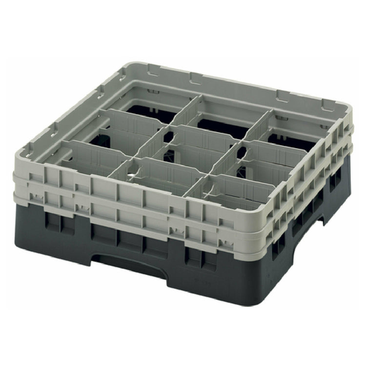 The Cambro 9S434110 Camrack® Glass Rack with (2) soft gray extenders is a full-size glass rack designed to enhance the efficiency and safety of glassware handling within the foodservice and hospitality industries. Measuring 19-3/4" x 19-3/4" x 7-1/4", this rack features (9) compartments that can accommodate glasses with a maximum diameter of 5-7/8" and a maximum height of 5-1/4". Its black color provides a sleek appearance suitable for professional settings. The inclusion of (2) soft gray extenders allows for added protection and versatility, catering to different glassware sizes and ensuring stability during transportation. The Camrack® is HACCP compliant, ensuring that it meets rigorous standards for food safety and hygiene. Additionally, it is NSF certified, which reinforces its reliability and suitability for commercial use. This glass rack is ideal for restaurants, bars, catering services, and other establishments that require efficient glassware management. Its durable construction and thoughtful design provide a practical solution for maintaining the cleanliness and organization of glassware, contributing to the overall operational efficiency of any enterprise relying on consistent and safe glassware handling.