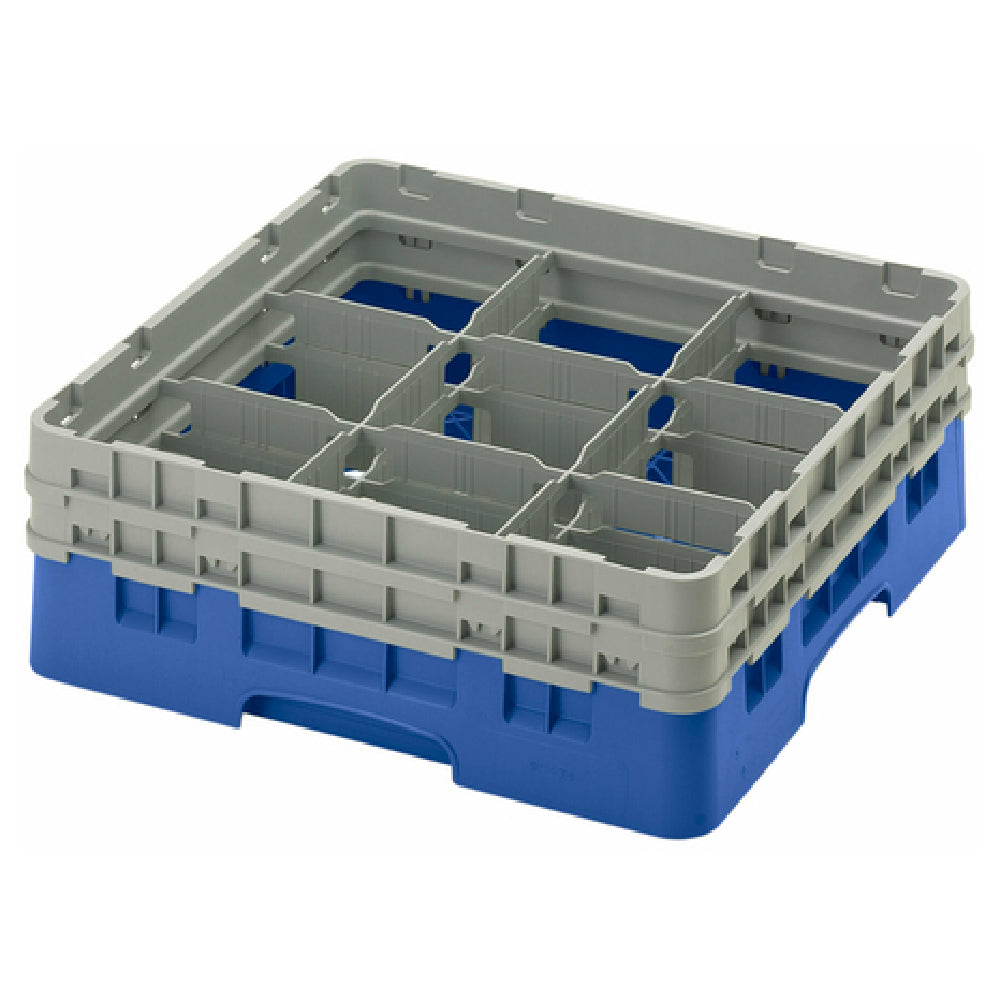 The Cambro 9S434168 Camrack® Glass Rack With (2) Soft Gray Extenders Full Size is an essential utility designed to enhance operations in various segments of the food and beverage industry. This full-size rack measures 19-3/4" x 19-3/4" x 7-1/4", accommodating a diverse range of glassware with its nine compartments. Each compartment supports a maximum diameter of 5-7/8" and a height of 5-1/4", ensuring optimal fitting for different glass sizes. The inclusion of two soft gray extenders enhances its versatility, allowing for more extensive use across different environments. The glass rack is crafted in a distinctive blue hue, adding a professional aesthetic to its functional design. It adheres to HACCP compliance, aligning with high standards of food safety and hygiene, while also being NSF certified, which underscores its commitment to quality and safety in commercial settings. This Camrack® Glass Rack is particularly valuable for establishments that prioritize efficient glassware handling, offering a robust solution for storage and transport. Its design is both pragmatic and durable, making it suitable for busy environments that demand reliable performance and easy maintenance.