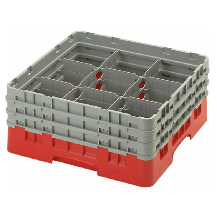 The Cambro 9S638163 Camrack® Glass Rack with (3) soft gray extenders is a full-size, versatile solution for glassware storage and transportation, measuring 19-3/4" x 19-3/4" x 8-7/8". This robust glass rack features nine compartments, each supporting a maximum diameter of 5-7/8" and a maximum height of 6-7/8", making it an ideal choice for organizing various glass sizes securely. The included soft gray extenders add to the rack's adaptability by providing additional height and protection for taller glassware, ensuring optimal support and stability during handling. With a distinctive red color, this Camrack® is easily identifiable, streamlining operations in busy environments. It adheres to HACCP compliance standards, promoting safety in food and beverage settings, and is NSF certified, which underscores its adherence to stringent public health requirements. The Cambro 9S638163 is a preferred choice across different market segments, including restaurants, catering services, and hospitality venues, due to its ability to enhance operational efficiency and glassware protection. Its durable construction and thoughtful design make it an essential asset for businesses seeking reliable and effective glassware management solutions.