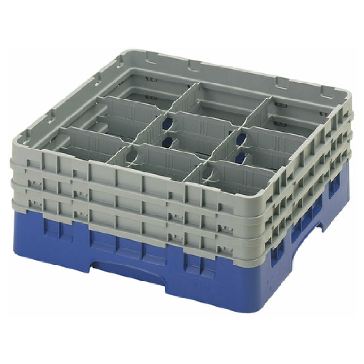 The Cambro 9S638186 Camrack® Glass Rack With (3) Soft Gray Extenders Full Size is a meticulously designed glass rack that caters to various industry needs with its robust and practical dimensions. Measuring 19-3/4 inches by 19-3/4 inches by 8-7/8 inches, this full-size rack is engineered to accommodate a wide range of glassware. It features nine compartments, each capable of holding glasses with a maximum diameter of 5-7/8 inches and a maximum height of 6-7/8 inches. The three soft gray extenders add to the rack's versatility, allowing for secure stacking and enhanced protection of glassware during storage and transportation. The navy blue color not only adds an aesthetic appeal but also aligns with organizational color-coding needs in professional environments. Importantly, this glass rack is HACCP compliant and NSF certified, which emphasizes its adherence to industry standards for health and safety. This makes it an ideal choice for industries such as food service, hospitality, and catering, where hygiene and safety are paramount. The Cambro 9S638186 Camrack® Glass Rack is an essential tool for efficient glass handling, providing durability and reliability in demanding operational settings.