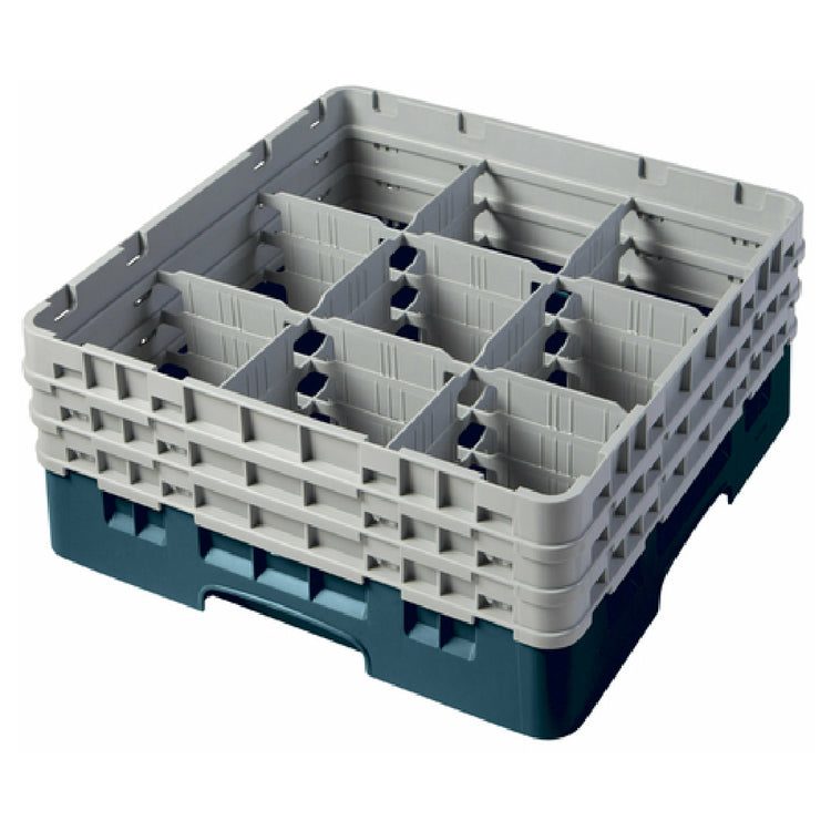 The Cambro 9S638414 Camrack® Glass Rack with (3) Soft Gray Extenders Full Size is a precision-engineered storage solution specifically designed for the food service and hospitality industries, ensuring optimal glassware organization and protection. With dimensions of 19-3/4" x 19-3/4" x 8-7/8", this full-size rack provides ample space across its nine compartments, each accommodating a maximum diameter of 5-7/8" and a maximum height of 6-7/8". Its teal coloration not only adds a touch of aesthetic appeal but also serves as a functional feature for easy identification in busy kitchen environments. The inclusion of three soft gray extenders enhances the rack's capacity and flexibility, accommodating a variety of glass sizes while ensuring secure and stable stacking. The Cambro 9S638414 is HACCP compliant, ensuring adherence to critical food safety practices, and is NSF certified, demonstrating its compliance with stringent public health and safety standards. This glass rack is ideal for commercial settings that demand reliability and efficiency, providing exceptional protection and organization for glassware in restaurants, catering operations, and banquet facilities. Its integration of design and functionality underscores Cambro's commitment to quality and innovation in food service solutions.