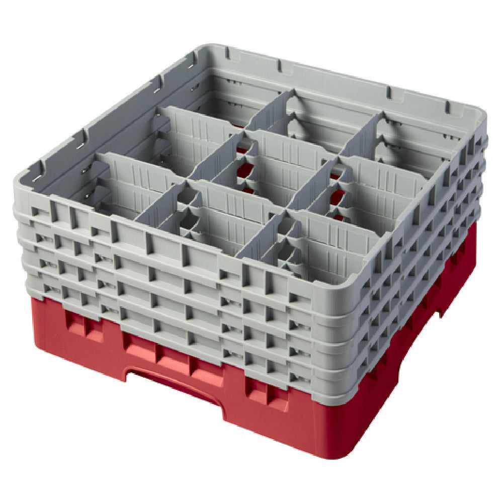 The Cambro 9S800163 Camrack® Glass Rack With (4) Soft Gray Extenders Full Size is an efficient solution for organizing and storing glassware in food service establishments. Measuring 19-3/4 inches by 19-3/4 inches by 10-1/2 inches, this glass rack is designed to accommodate a wide range of glass sizes with its nine compartments, each supporting a maximum diameter of 5-7/8 inches and a maximum height of 8-1/2 inches. This ensures optimal protection and cleanliness for glassware during storage and transport. The rack is equipped with four soft gray extenders, enhancing its capacity and versatility for various glass heights. Its bold red color facilitates easy identification and organization within busy kitchen environments. The Cambro Camrack is HACCP compliant, supporting food safety protocols, and carries NSF certification, attesting to its adherence to high standards of quality and safety. Ideal for restaurants, catering services, and any food service operation requiring robust glassware management, this full-size glass rack is a practical, durable, and reliable accessory that meets the rigorous demands of the industry. Its thoughtful design not only safeguards glassware but also streamlines operations by integrating smoothly into existing workflows and storage systems.