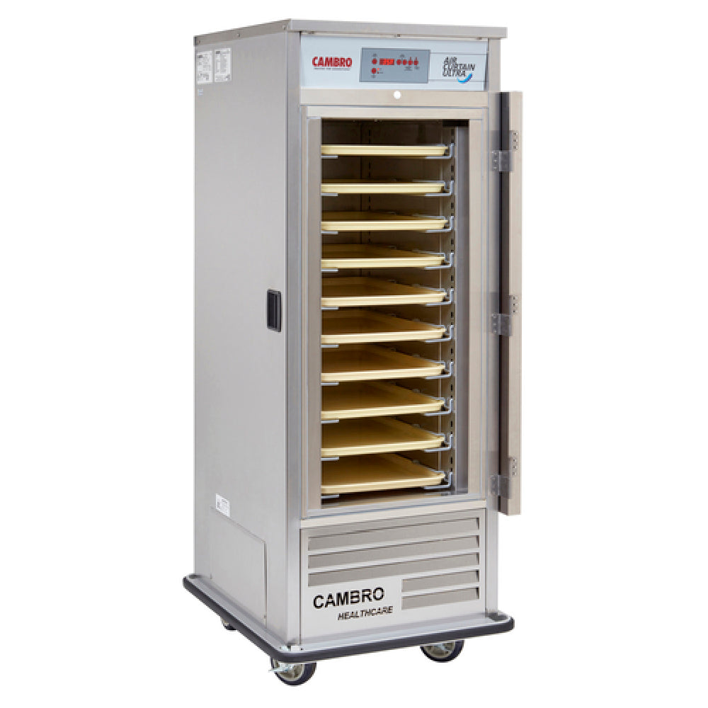 The Cambro ACU1826L000 Refrigerator Air Curtain Ultra™ is a highly efficient one-section refrigeration unit featuring bottom-mounted self-contained refrigeration and an active defrost system, making it suitable for various food service environments. It includes advanced digital controls, allowing precise temperature management tailored to specific needs. Designed with a full 270° left door swing, it accommodates easy access and maximizes storage convenience. Its capacity to hold ten full-size or twenty half-size sheet pans makes it versatile for large-scale operations. Constructed with a durable stainless steel exterior and interior, this unit ensures longevity and easy cleaning. The refrigerator is equipped with a rear-mounted stainless steel push handle bar and recessed side hand grips for enhanced maneuverability. Additionally, it features 6-inch casters, including two rigid and two swivel casters with brakes, facilitating smooth mobility and stability. Operating on 120v/60/1-ph with a 1/2 HP and 780 watts motor, it draws 6.5 amps and comes with a NEMA 5-15P plug. The ACU1826L000 is UL EPH Classified, DOE 19 Compliant, and NSF certified, ensuring adherence to high safety and efficiency standards. This refrigerator is ideal for institutions requiring reliable, high-capacity refrigeration solutions.