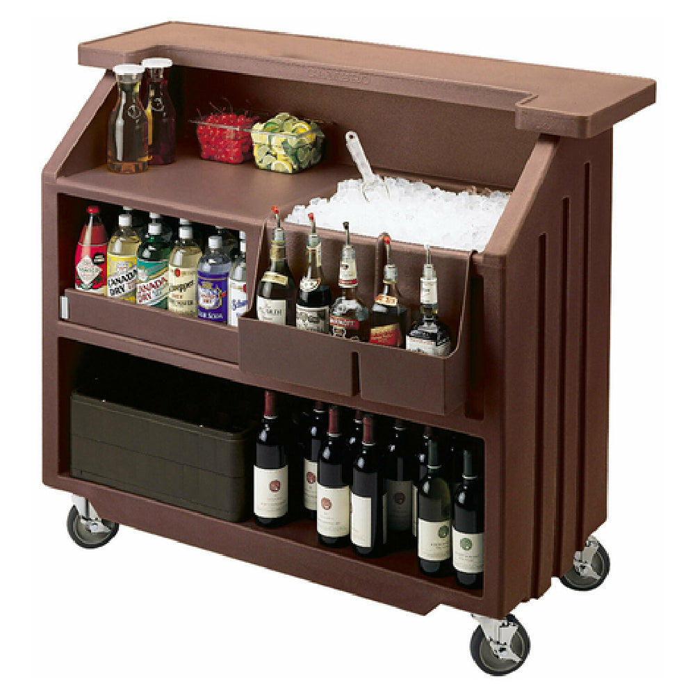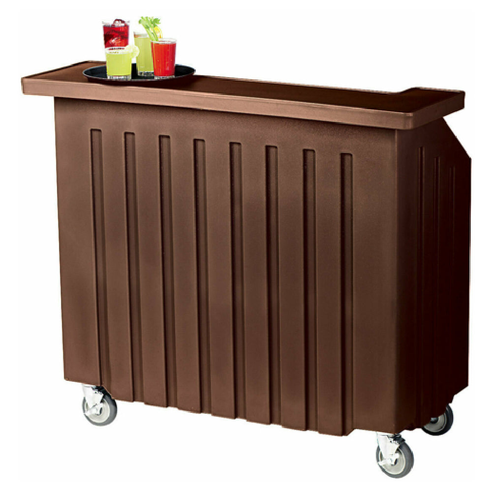 The Cambro BAR540131 Cambar® Portable Bar is a meticulously designed unit with dimensions of 54"L x 25-7/8"W x 46-1/8"H, offering both functionality and aesthetic appeal for various industry segments. This portable bar includes a substantial 80 lb. ice sink complete with a drain, ensuring efficient ice management during service. Its construction from durable polyethylene guarantees longevity, while the dark brown finish provides an elegant appearance suitable for any setting. The removable 5-bottle speed rail and top shelf allow for customizable storage solutions, catering to versatile beverage service needs. Four 5" swivel casters with brakes provide remarkable mobility and stability, making it easy to reposition the bar as required. The inclusion of a vinyl cover adds an extra layer of protection when the bar is not in use. This portable bar is a valuable asset for catering services, hotel and restaurant events, and private gatherings, offering a seamless blend of practicality and style.