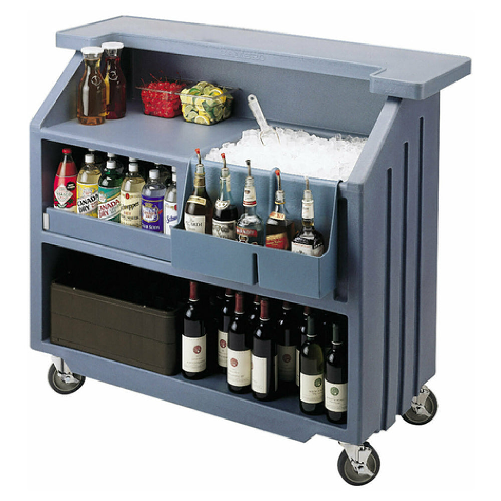 The Cambro BAR540401 Cambar® Portable Bar is engineered to meet the versatile demands of the hospitality industry, featuring a compact yet efficient design measuring 54L x 25-7/8W x 46-1/8H inches. It is constructed from durable polyethylene, ensuring longevity and resistance to the rigors of frequent use. Integral to its design is an 80 lb. ice sink complete with a drain, optimizing beverage service efficiency. This portable bar includes a removable 5-bottle speed rail and top shelf, adding flexibility and ease of use in various service settings. The BAR540401 is equipped with four 5-inch swivel casters with brakes, facilitating effortless mobility and secure placement. Its slate blue vinyl cover offers a professional aesthetic, while also providing practical protection. The Cambro BAR540401 is particularly advantageous for event catering, mobile bars, and banquet services, effectively combining functionality and style in one portable unit, catering to varying needs across different market segments within the hospitality industry.