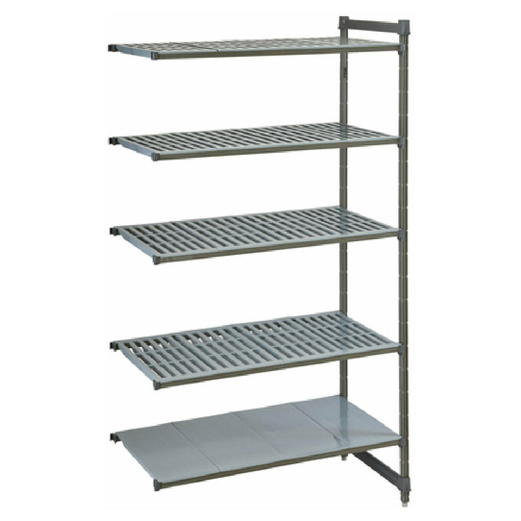 The Cambro CBA184284VS5580 Camshelving® Basics Plus Add-On Unit is a versatile and robust shelving solution designed to meet the demanding needs of various industry segments. Measuring 18"W x 42"L x 84"H, this 5-tier shelving unit is constructed to withstand temperatures ranging from -36°F (-38°C) to 190°F (88°C), making it suitable for environments with fluctuating temperatures. The unit includes four vented and one solid polypropylene shelf plates, each equipped with Camguard® antimicrobial protection to enhance hygiene and cleanliness. The shelving system features two composite posts with installed leveling feet, ensuring stability on uneven surfaces. Pre-assembled post connectors and wedges, along with ten traverses and five bags of eight dovetails (four each A & B), facilitate straightforward assembly and customization. Each shelf boasts a 600 lbs. capacity, with the top shelf supporting up to 400 lbs., culminating in a maximum unit capacity of 1,800 lbs. The brushed graphite finish adds a sleek, professional appearance to any space. NSF certification highlights its compliance with industry health and safety standards, making it an excellent choice for food service, hospitality, and retail industries that require reliable, high-capacity shelving solutions.