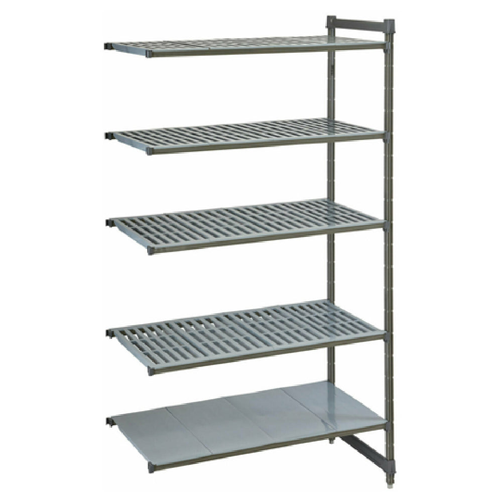The Cambro CBA185484VS5580 Camshelving® Basics Plus Add-On Unit is an expertly designed storage solution, measuring 18 inches in width, 54 inches in length, and 84 inches in height. This 5-tier shelving unit is engineered to withstand a wide temperature range from -36°F (-38°C) to 190°F (88°C), making it suitable for diverse environments. It features four vented and one solid polypropylene shelf plate, each integrated with Camguard® antimicrobial protection to ensure hygienic storage. The unit is supported by two composite posts equipped with leveling feet for stability. It includes pre-assembled post connectors and wedges, along with ten traverses and five bags containing eight dovetails (four each of A & B), enabling easy assembly. Each shelf boasts a capacity of 600 lbs, with the top shelf supporting up to 400 lbs, and a total maximum capacity of 1,800 lbs. Finished in brushed graphite, this Camshelving® unit offers a robust and reliable storage option, certified by NSF for safety and quality assurance. Ideal for foodservice operations, this unit combines durability with advanced shelving technology, catering to a range of professional environments that demand high standards of efficiency and cleanliness.