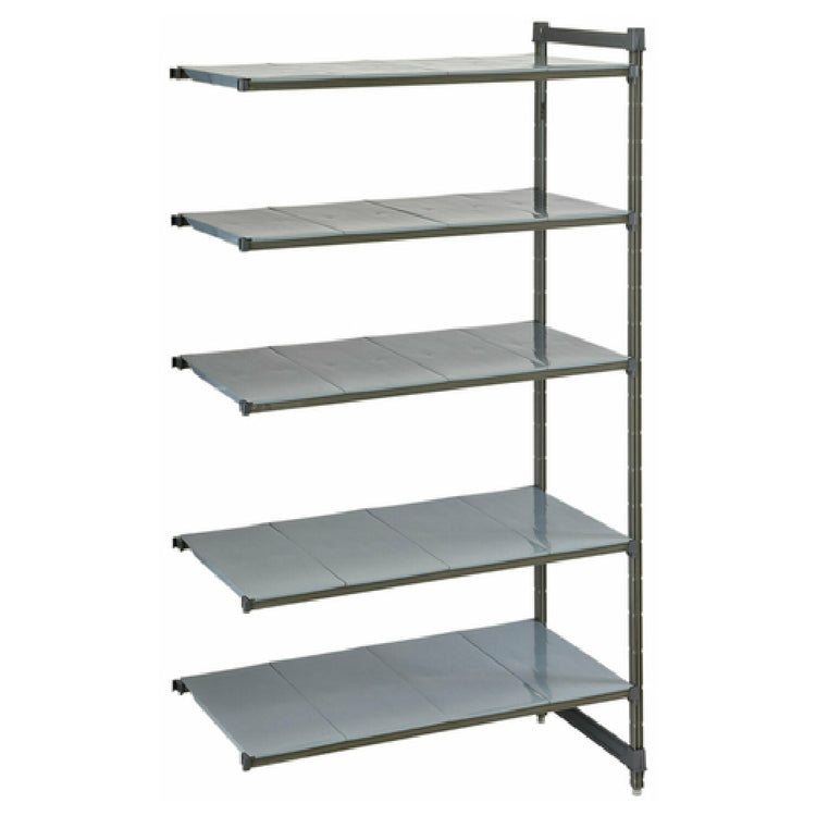 The Cambro CBA245484S5580 Camshelving® Basics Plus Add-On Unit is a versatile 5-tier shelving system measuring 24"W x 54"L x 84"H, designed to meet diverse storage needs across various industries. This unit features five solid polypropylene shelf plates, each equipped with Camguard® antimicrobial protection to ensure hygiene and safety. With a remarkable temperature tolerance, it can withstand environments ranging from -36°F (-38°C) to 190°F (88°C), making it suitable for a wide range of storage conditions. The unit includes two composite posts with leveling feet, pre-assembled post connectors and wedges, ten traverses, and five bags of eight dovetails (four each A & B), providing a robust and customizable structure. Each shelf supports up to 600 lbs., with the top shelf supporting 400 lbs., culminating in a maximum capacity of 1,800 lbs. The brushed graphite finish offers a sleek, professional appearance, while compliance with NSF standards ensures its suitability for safe use in food service and other regulated industries. This add-on unit is ideal for those seeking durable and reliable shelving solutions that blend functionality with stringent industry standards.