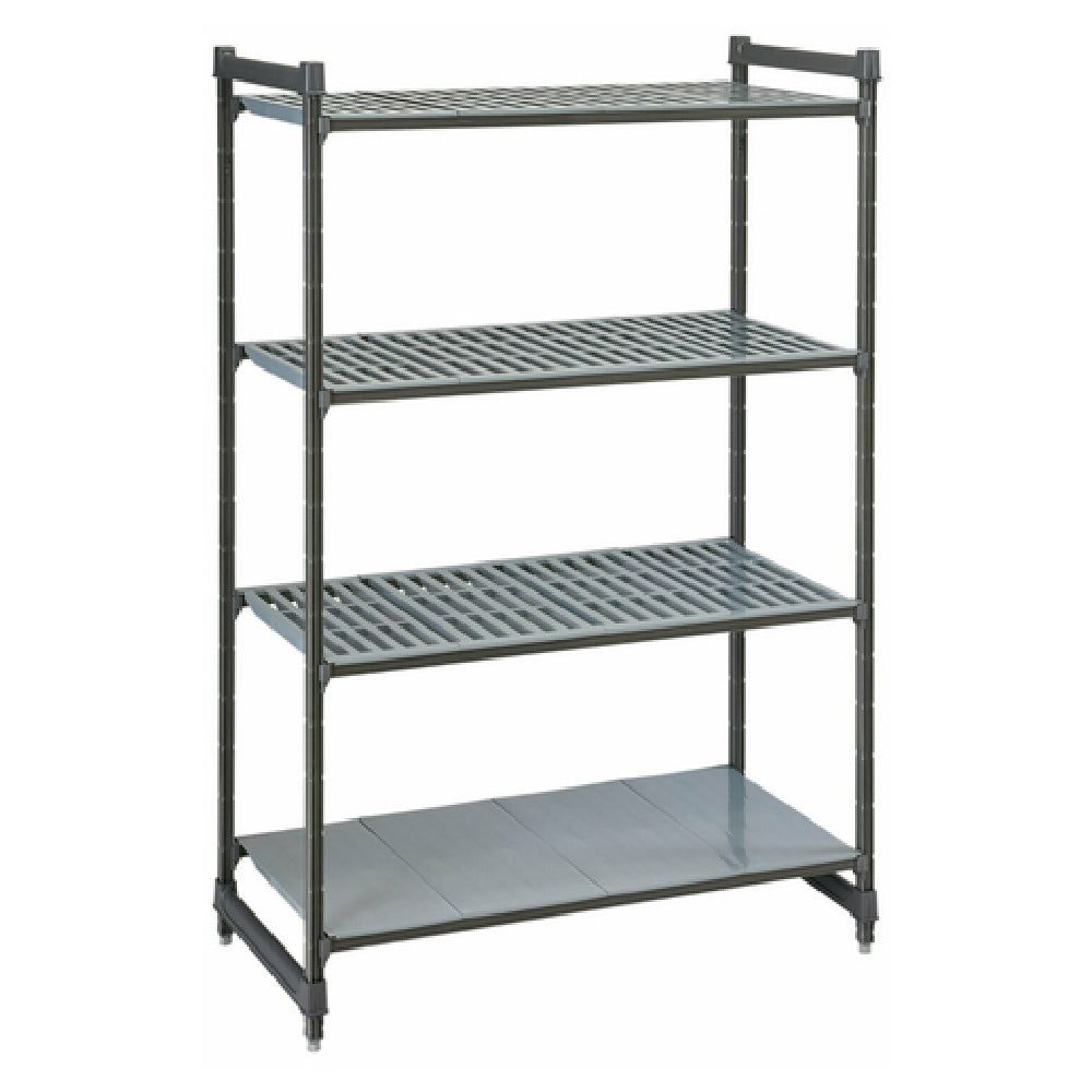 The Cambro CBU213664VS4580 Camshelving® Basics Plus Starter Unit is a meticulously designed storage solution ideal for a wide range of temperature conditions and storage needs within professional environments. Measuring 21" wide, 36" long, and 64" high, this 4-tier unit is engineered to withstand temperatures from -36°F (-38°C) to 190°F (88°C), making it suitable for both cold storage and warmer settings. The unit includes three vented and one solid polypropylene shelf plates, all equipped with Camguard® antimicrobial protection to ensure hygiene and safety. Supported by four composite posts with installed leveling feet, the unit ensures stability and balance. Its assembly includes pre-assembled post connectors and wedges, along with eight traverses and four bags of dovetails (four each A & B), facilitating straightforward setup. Each shelf boasts a capacity of 600 lbs., with the top shelf supporting 400 lbs., contributing to a total maximum capacity of 1,800 lbs. The brushed graphite finish not only enhances the unit's aesthetic appeal but also ensures durability and easy maintenance. NSF certification reinforces its adherence to public health standards, making it a trusted choice for various segments within the food service industry, including restaurants, catering services, and institutional kitchens.