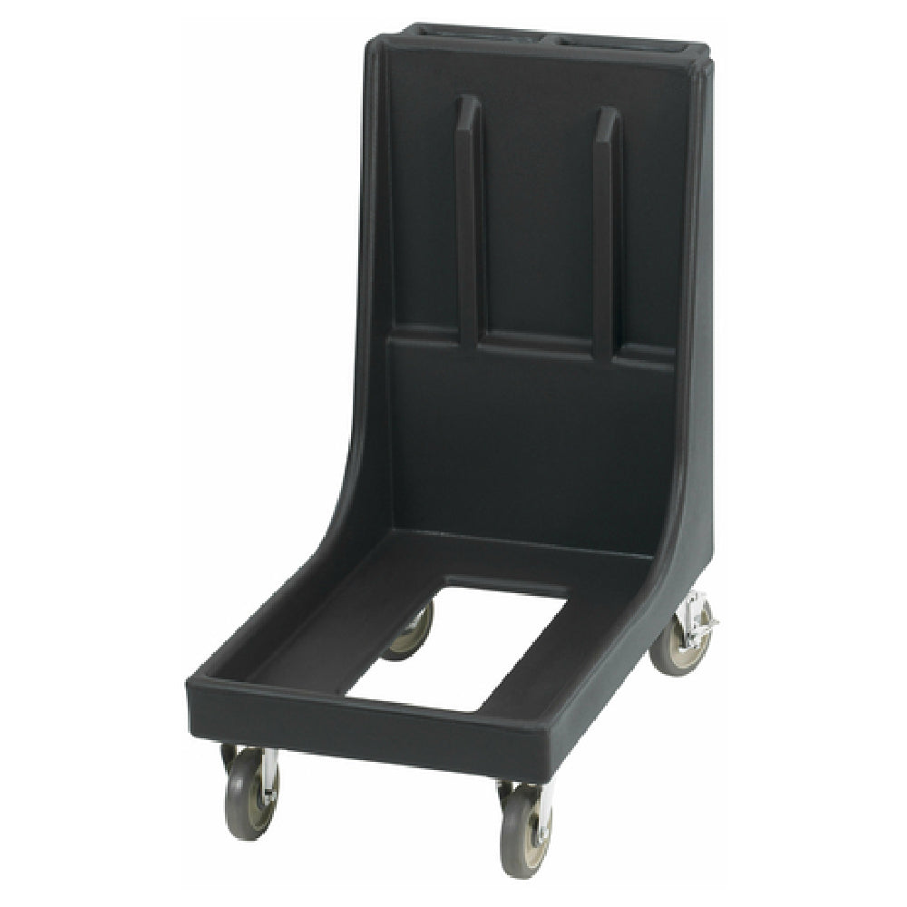 The Cambro CD100H110 Camdolly® With Handle is a versatile and robust transport solution for various industry needs, featuring exterior dimensions of 33-1/8"L x 19-1/2"W x 36-1/4"H. This Camdolly® is engineered to efficiently handle loads up to 350 lbs., making it an essential tool for businesses requiring reliable and heavy-duty transportation of goods. Equipped with 5" casters, the dolly offers two fixed and two swivel casters, with one caster featuring a brake for added stability and control during movement. Its black color provides a sleek, professional appearance, complementing various operational environments. Furthermore, the Camdolly® is NSF certified, ensuring that it meets stringent public health and safety standards. The integrated handle enhances maneuverability, making it particularly advantageous for food service industries, catering businesses, or any setting where mobility and ease of use are priorities. With its durable construction and practical design, the Cambro CD100H110 Camdolly® With Handle serves as an indispensable asset, streamlining operations and improving efficiency across multiple sectors.