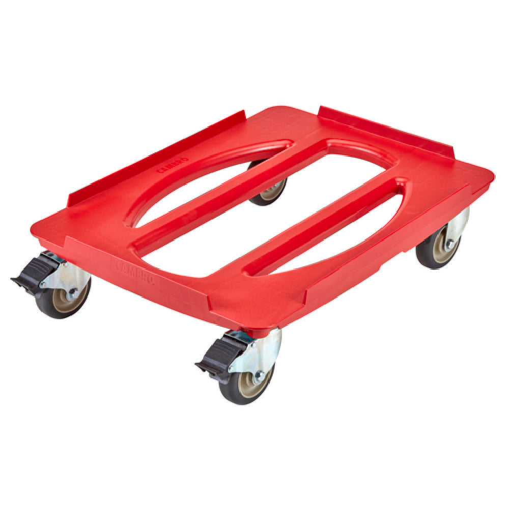 The Cambro CDC400358 Cam GoBox® Camdolly® is a dynamically designed transport solution with exterior dimensions of 25-3/10" L x 18-1/2" W x 6-9/10" H, perfectly engineered for the food service and catering industries. This robust platform dolly boasts a load capacity of 300 lbs., making it ideal for efficiently moving heavy loads with ease. Constructed from durable ABS plastic, it is designed for longevity and reliability in demanding environments. The vibrant red color adds visibility, enhancing safety during transportation tasks. Equipped with four swivel casters, two of which include brakes, it ensures secure maneuverability and stability on various surfaces. This Camdolly® is NSF certified, guaranteeing compliance with health standards and reinforcing its suitability for professional use. It is compatible with a range of Cambro's containers, including UPC400, EPP180XLT, EPP160, EPP180, EPP300, EPP400, UPC300, and 1826 Dough Boxes, showcasing its versatility in accommodating diverse storage needs. This makes the Cambro CDC400358 an essential asset for any commercial kitchen or catering operation, streamlining the transport of goods while maintaining a high standard of efficiency and safety.