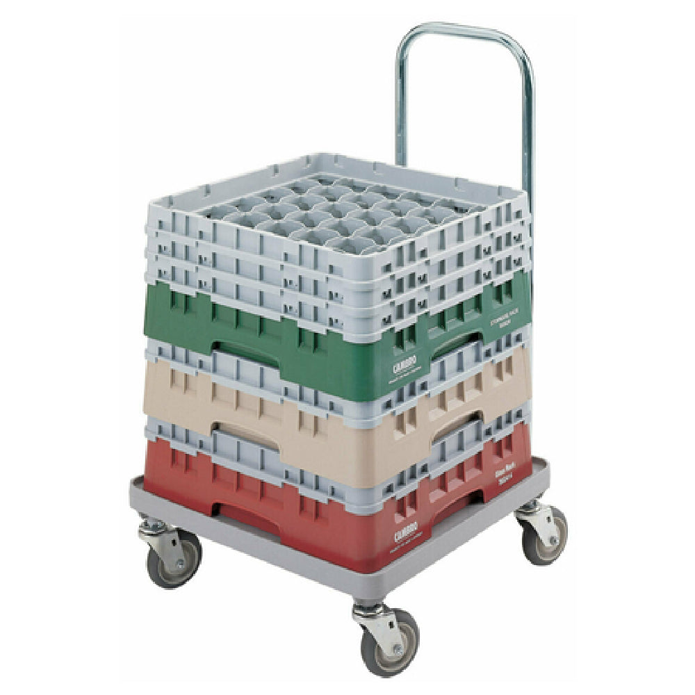 The Cambro CDR2020H151 Camdolly® for Camracks is a specialized transport solution designed to accommodate the demanding needs of food service and catering industries. Measuring 23-3/8 inches in length, 21-3/8 inches in width, and 37 inches in height, this dolly features an ergonomic handle that facilitates easy maneuverability. It boasts a platform design supported by four swivel casters, each with a size of 3-1/2 inches, ensuring smooth and efficient movement across various surfaces. Notably, the Camdolly is constructed without brakes, emphasizing its lightweight and mobile nature. Crafted from soft gray polypropylene, the dolly is both durable and lightweight, providing a robust solution for transporting Camracks without compromising on ease of use. This durable construction ensures that the dolly can withstand the rigors of a busy kitchen or dining environment, making it an indispensable tool for operations that require frequent and reliable transportation of dish racks. The Cambro CDR2020H151 Camdolly® is particularly valuable for establishments that prioritize efficiency and durability in their equipment, supporting seamless workflow in both front and back-of-house settings.