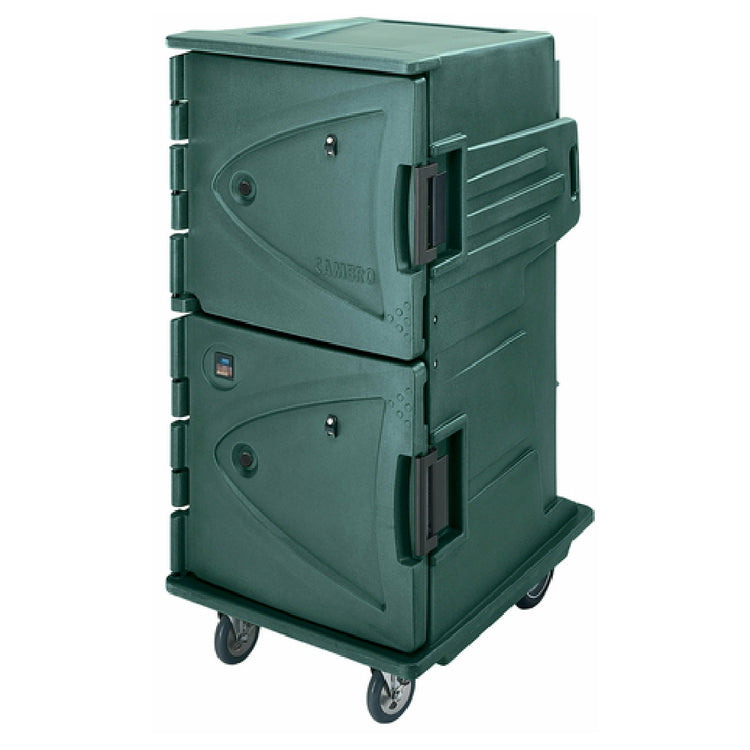 The Cambro CMBH1826TBC192 Camtherm® Hot Cart is a versatile and efficient solution for foodservice operations requiring reliable hot storage. Measuring 30-1/2"W x 39"D x 64-3/8"H, this electric hot cart supports a tall profile and double door design, accommodating various pan sizes. It holds up to twelve 18" x 26" sheet pans, requiring five additional rail sets. Additionally, it can store twenty-four 12" x 20" x 2-1/2" deep food pans, sixteen 12" x 20" x 4" deep food pans, twelve 12" x 20" x 6" deep food pans, and eight 12" x 20" x 8" deep food pans. Equipped with a temperature control dial and Celsius solar digital thermometer, the cart ensures precise temperature management. Its polyethylene exterior and molded-in handles with bumpers enhance durability and mobility. The cart includes a serving top with a vent, a menu clip, and adjustable chrome-plated steel slide rails. With two 6" front swivel casters with brakes and two 10" rear casters, it offers easy maneuverability. Operating at 110v/50/60/1-ph with 1587 watts and 14 amps, the granite green hot cart features a NEMA 5-15P plug and is NSF and ENERGY STAR® certified. This makes it an excellent choice for catering services, restaurants, and institutional kitchens.