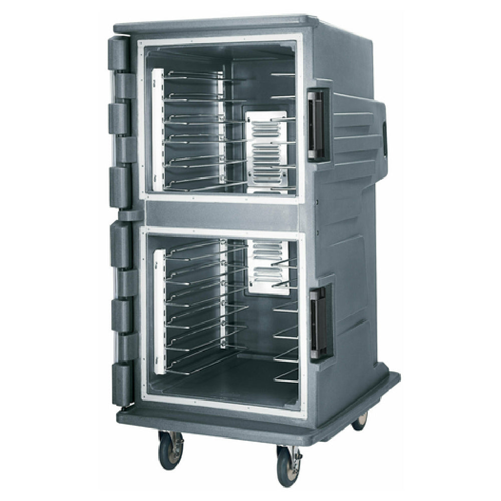The Cambro CMBHC1826TSF191 Camtherm® Hot/Cold Cart is a highly versatile electric unit designed for maintaining optimal food temperatures, suitable for various food service segments. With a tall profile and dimensions of 30-1/2"W x 39"D x 64-3/8"H, this cart efficiently accommodates a variety of pan sizes: twelve 18" x 26" sheet pans (requiring five additional rail sets), twenty-four 12" x 20" x 2-1/2" deep food pans, sixteen 12" x 20" x 4" deep food pans, twelve 12" x 20" x 6" deep food pans, and eight 12" x 20" x 8" deep food pans. It features a temperature control dial and an on-off power switch, ensuring precise management of internal conditions. The adjustable chrome-plated steel slide rails, Fahrenheit solar digital thermometer, and molded-in handles and bumpers enhance functionality and user convenience. Its durable polyethylene exterior is complemented by a serving top and menu clip, while mobility is facilitated by two 6" front swivel casters with brakes and two 6" rear casters. Operating at 110v/50/60/1-ph, with a power output of 1570 watts and 14.3 amps, it comes with a 9' cord and plug, is granite gray in color, and holds certifications including NSF, ENERGY STAR®, and cETLus.
