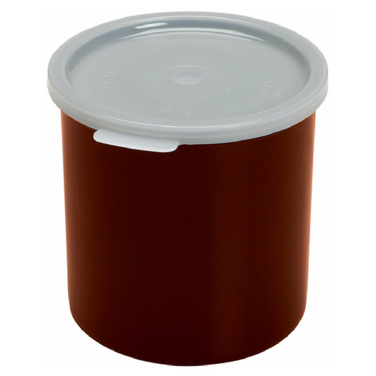 The Cambro CP12195 Crock 1.2 Qt. is a highly functional and versatile storage solution, designed for both professional kitchens and home use. This round crock, with dimensions of 5-1/16 inches in diameter and a height of 5-3/16 inches, provides a compact yet ample 1.2-quart storage volume, making it ideal for storing a variety of ingredients, from condiments to salad dressings. Constructed from durable polypropylene, it ensures long-lasting performance and resistance to everyday wear and tear. Its reddish-brown hue adds a touch of warmth and style to any kitchen setup. A key feature is its polyethylene lid, which ensures a secure fit, maintaining the freshness and quality of stored contents. The crock is also dishwasher safe, allowing for easy cleaning and maintenance, which is essential in fast-paced culinary environments. Additionally, the Cambro CP12195 is NSF certified, guaranteeing its compliance with rigorous health and safety regulations. This crock is perfect for caterers, restaurant chefs, and home cooks who value both functionality and aesthetic appeal in their kitchenware. Its design and features make it a reliable choice for efficient food storage, contributing to streamlined kitchen operations.