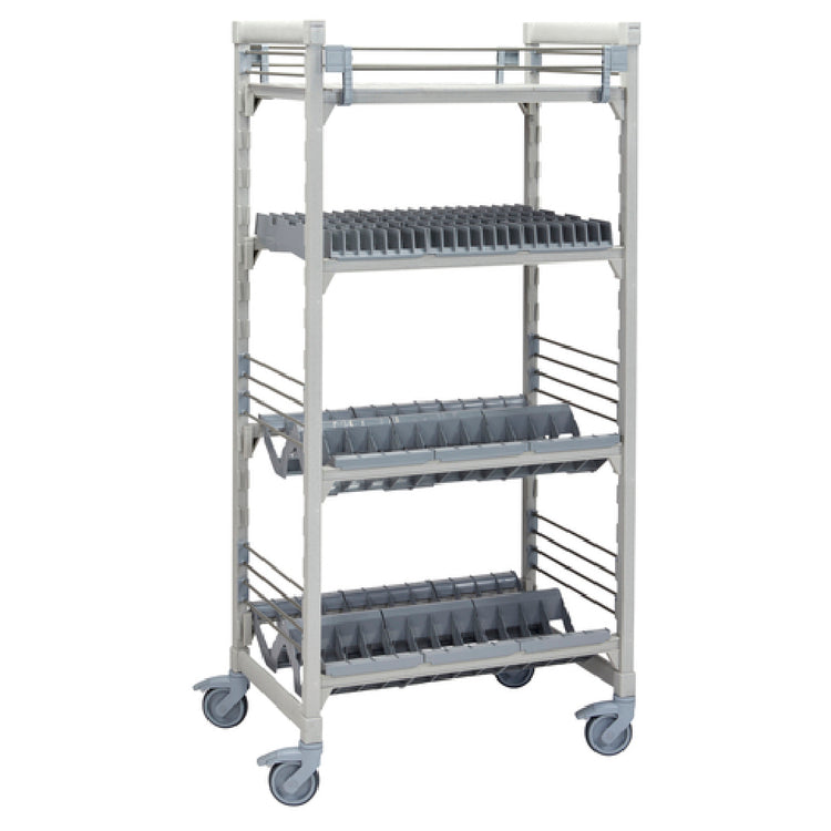 The Cambro CPMU243675D2PKG Camshelving® Premium Series Mobile Drying/Storage Rack is a versatile and robust solution designed to meet the high demands of various industry segments. Measuring 24 inches wide, 36 inches long, and 75 inches high, this rack features four levels for optimized storage - a top vented shelf, two tiers with angled cradles, and one shelf with vertical cradles. Its construction includes two pre-assembled post sets, eight end rail kits, and a full shelf rail kit specifically for the top vented shelf, ensuring stability and organization. The rack is highly mobile, thanks to four premium swivel casters equipped with a total locking brake, providing ease of movement and secure positioning. Made from Camguard® antimicrobial plastic, it offers a maximum weight capacity of 900 lbs, ideal for environments requiring rigorous hygiene standards. The speckled gray finish complements its durable build, making it a suitable choice for demanding settings. The components of this product are NSF listed, underscoring its compliance with industry safety regulations. This rack ships in 14 cartons, ensuring safe and organized delivery. Whether for drying or storage, this Cambro rack is engineered to deliver superior performance and reliability.