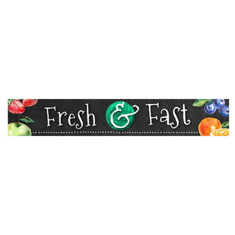 The Cambro CSFLEXMERCH3000 Camshelving® Flex Station Merchandiser Signs "Fresh And Fast" is a specialized display component designed to enhance the visibility and appeal of products. Tailored to fit 24-inch deep units, this merchandiser offers an effective signage solution for businesses looking to promote a "Fresh and Fast" message. It includes a single top/header/panel, engineered to seamlessly integrate with existing shelving without the need for additional accessories or units. This focus on easy integration makes it ideal for a range of settings, from retail environments to food service operations, seeking to enhance presentation and communication. By utilizing the Camshelving® Flex Station Merchandiser Signs, businesses can capitalize on organized and visually appealing displays that attract customers' attention and reinforce product freshness and speed of service. The precise fit for 24-inch deep units ensures that each installation is secure and professional, contributing to a cohesive merchandising strategy. Although it is sold separately from other shelving accessories and units, its design compatibility with Cambro's reputable shelving systems ensures that it meets industry standards for durability and performance. This product serves as a versatile tool for any market segment looking to maximize product visibility and streamline merchandising efforts.