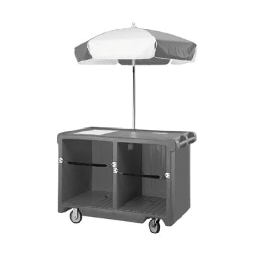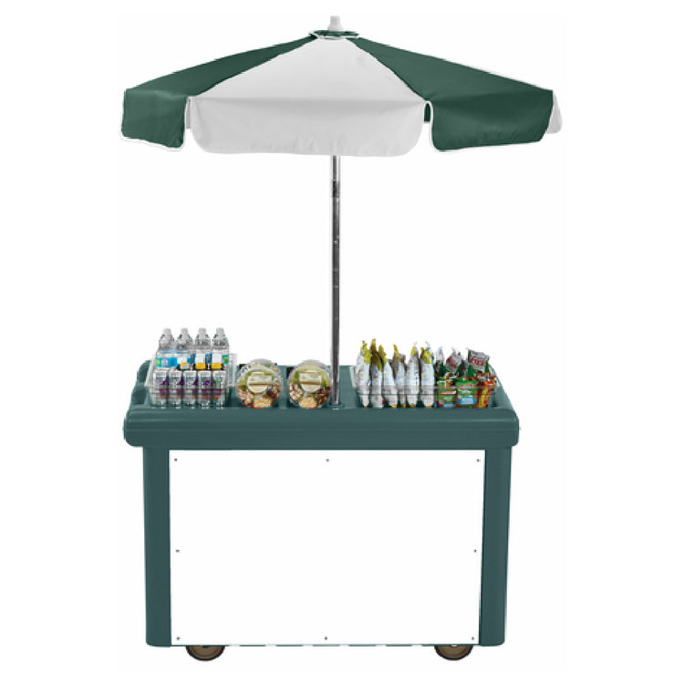 The Cambro CVC55192 Camcruiser® Vending Cart is a versatile and mobile solution for various vending needs, measuring 55-3/16 inches by 31-1/4 inches by 93-1/2 inches in height. It features a full-size countertop well, complete with a white polyethylene cutting board, providing ample space for food preparation and service. This vending cart includes two rear compartments for convenient storage, and an opening designed for electrical or soda line passage, enhancing its utility for different vending applications. The unit is complemented by a 60-inch diameter umbrella in a complementary green and white design, perfect for outdoor use. Mobility is assured with four 6-inch casters, two of which are fixed while the other two swivel and include a brake for stability. Constructed from robust polyethylene in a granite green finish, the Camcruiser® not only ensures durability but also an appealing aesthetic. This cart is particularly suitable for outdoor events, school campuses, or business parks, providing a reliable and efficient vending setup. Its thoughtful design and high functionality make it an ideal choice for operators looking to expand their service capabilities with a sturdy, eye-catching vending cart that meets diverse industry needs.