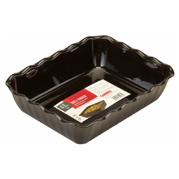 The Cambro DC10110 Deli Crock is a versatile and durable solution for food display and storage, offering a generous capacity of 4.9 quarts. Measuring 13-3/16 inches by 10-7/16 inches, its rectangular shape optimizes space for efficient food presentation. The crock features a distinctive scalloped pattern, enhancing its visual appeal in any culinary setting. Constructed from SAN (Styrene Acrylonitrile) material, the Deli Crock is engineered to resist impact, stains, breaks, and chips, ensuring long-lasting performance and maintaining its professional appearance over time. Its sleek black finish complements various culinary themes, making it a fitting choice for delis, buffets, or catered events. Additionally, the Cambro DC10110 is NSF certified, underscoring its adherence to public health and safety standards, making it a reliable choice for food service operations seeking quality and compliance. This deli crock's robust design and aesthetic versatility cater to a wide range of market segments within the food industry, providing an invaluable asset for establishments that require both functionality and style in their presentation of culinary offerings.
