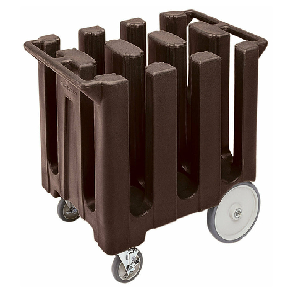 The Cambro DC700131 Dish Caddies Cart is designed to streamline dish storage and transport with its efficient poker chip design. Measuring 32-5/8 inches wide, 23-1/2 inches long, and 31-3/4 inches high, this cart accommodates a maximum dish size of 7 inches across its six columns. The non-adjustable structure ensures stability and simplicity in dish organization. Crafted from durable polyethylene, this dish caddy is built to withstand the demands of busy food service environments. It features molded handles for easy maneuverability, paired with two 5-inch swivel casters equipped with brakes for secure stationary positioning. Additionally, two 10-inch easy wheels facilitate smooth transportation across various surfaces. To maintain cleanliness and protect stored dishes, the cart includes a vinyl dust cover. The dark brown color complements professional kitchen aesthetics. This product is NSF certified, ensuring it meets health and safety standards essential for the food service industry. Ideal for restaurants, catering services, and banquet facilities, the Cambro DC700131 Dish Caddies Cart enhances operational efficiency by providing a reliable, organized solution for dish management.