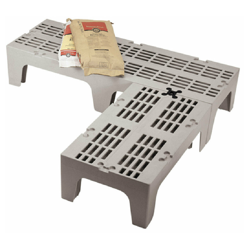 The Cambro DRS480480 S-Series Dunnage Rack is a high-performance storage solution designed to support a substantial load capacity of 3000 lb., making it an essential asset for various industry sectors requiring robust storage. Its dimensions - 21"D x 48"W x 12"H - are optimally configured to provide ample space while maintaining stability. Constructed from durable polypropylene, the rack boasts a one-piece, seamless double wall construction that enhances its structural integrity and longevity. The inclusion of a Camlink® ensures secure connectivity and modular expansions if needed. Featuring 4" square legs, the design elevates the rack, allowing for easy access and cleaning, while the slotted top facilitates proper airflow and drainage, preventing moisture accumulation and promoting hygiene. Finished in an attractive speckled gray, the rack seamlessly blends into various environments, adding aesthetic value. As NSF certified, it assures compliance with rigorous health and safety standards, asserting its suitability for foodservice, warehousing, and other demanding settings where sanitation and durability are paramount. This dunnage rack stands out in its class, providing reliable support and efficiency in diverse operational contexts, from commercial kitchens to storage facilities, embodying both functionality and versatility in its design.