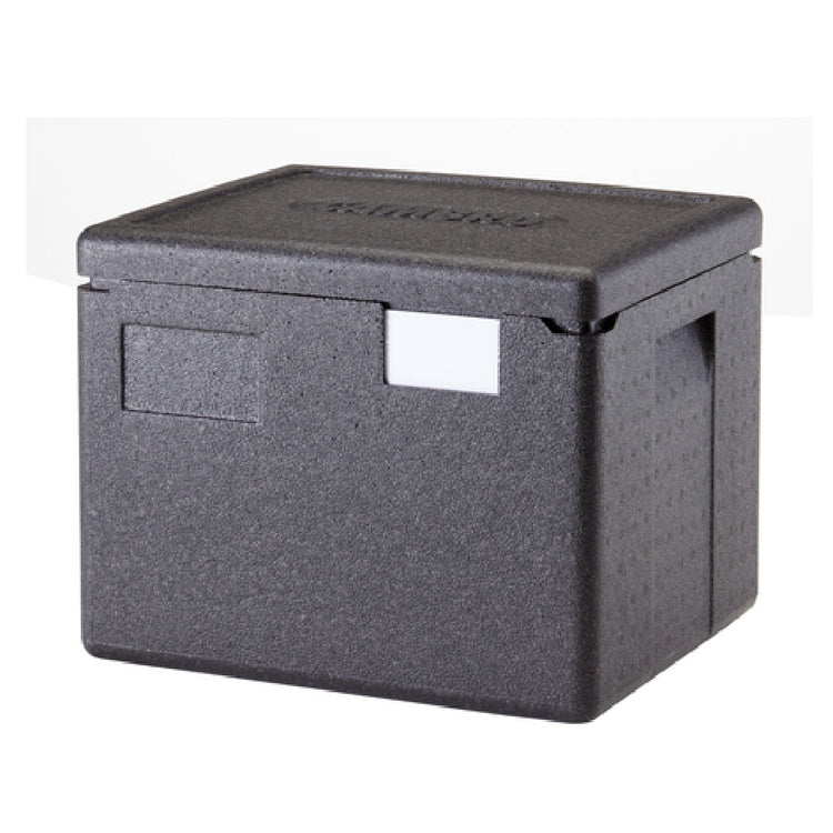 The Cambro EPP280SW110 Cam GoBox® Insulated Food Pan Carrier - 23.6 Qt. Top Load is a highly efficient solution for food service professionals requiring reliable temperature maintenance. This carrier is expertly crafted to accommodate a GN 1/2 sized food pan up to 8 inches deep, providing substantial capacity for a range of catering and food transport needs. Constructed from EPP (expanded polypropylene foam), the carrier is notably lightweight yet incredibly impact-resistant, making it perfect for frequent handling and transport. Ergonomic handles enhance user comfort during transit, while the drip-resistant and stackable design ensures practicality and space-saving storage. The Cam GoBox® maintains safe temperatures for both hot and cold foods for up to four hours, making it indispensable for both short-distance and extended transport situations. Its eco-friendly composition is 100% recyclable, aligning with environmental sustainability goals within the industry. Additionally, the product is dishwasher safe, simplifying the cleaning process and maintaining hygiene standards. Available in a sleek black, the Cambro EPP280SW110 combines functionality with durability, catering to the diverse needs of catering services, restaurants, and other food service establishments seeking a dependable food transport solution.