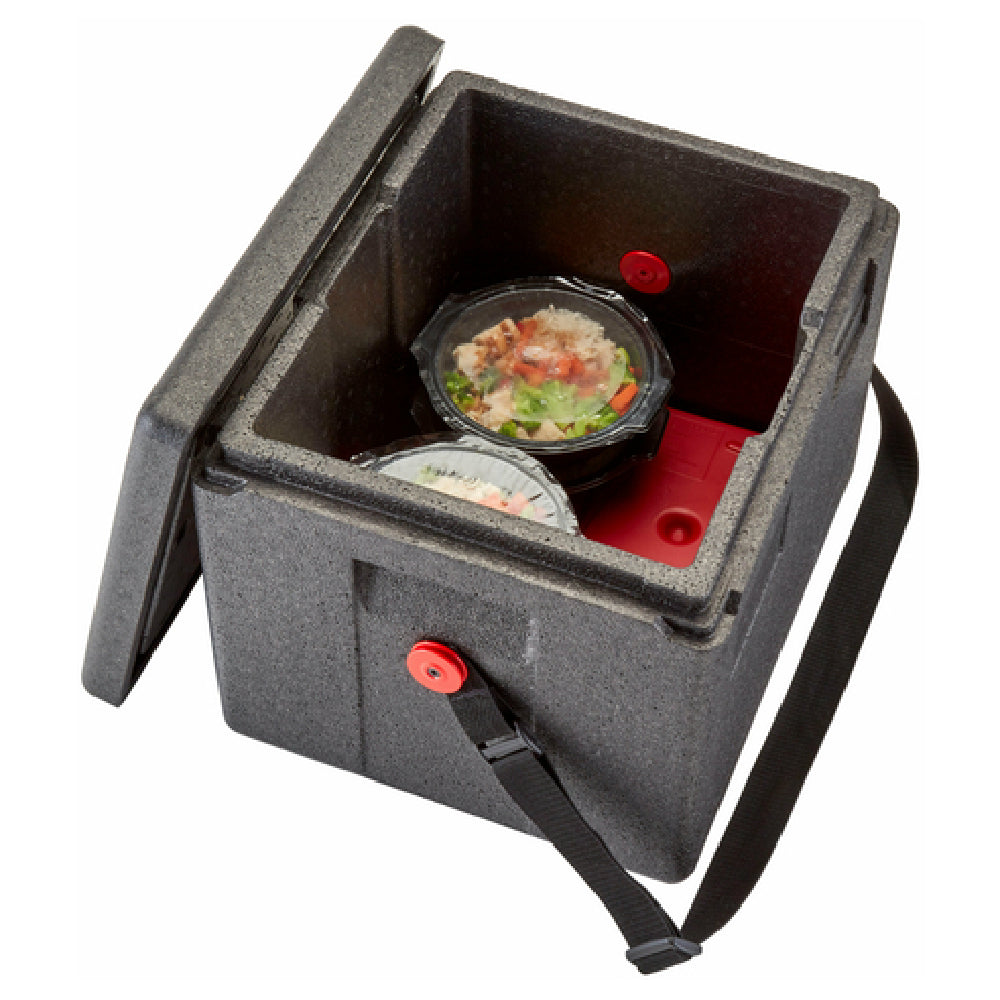 The Cambro EPP280WSTSW110 Cam GoBox® Insulated Food Pan Carrier - 23.6 Qt. Top Loader is engineered for efficient food transport and storage. This versatile carrier accommodates one GN 1/2 sized food pan up to 8 inches deep, making it an ideal choice for a variety of food service operations. A web strap enhances portability, while ergonomic handles ensure comfortable handling during transit. This carrier is designed to maintain safe temperature levels for both hot and cold food items for up to 4 hours, ensuring food quality and safety. Made from expanded polypropylene foam (EPP), the Cam GoBox® is lightweight, impact resistant, and eco-friendly, being 100% recyclable. It is dishwasher safe, which simplifies cleaning, and its drip-resistant design prevents unwanted spills. The stackable feature of this carrier maximizes storage efficiency, optimizing space in busy kitchens. Finished in black and shrink-wrapped for protection, the Cambro EPP280WSTSW110 combines practicality with sustainability, catering to diverse market segments within the food industry, such as catering services, restaurants, and institutional dining facilities, where maintaining food quality during transport is crucial. Its thoughtful construction and robust materials make it a reliable and valuable asset for professionals seeking durability and performance in food transportation solutions.
