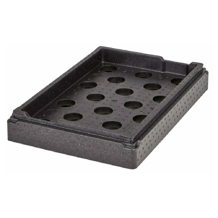 The Cambro EPPCTS110 Cam GoBox® Chiller Insert is a specialized accessory designed to enhance the cold holding time of insulated carriers such as the EPP180, EPP180S, and EPP160. Engineered to fit seamlessly between the lid and the box, this chiller insert incorporates built-in cutouts that facilitate efficient cold transfer, ensuring optimal temperature retention. Crafted from EPP (expanded polypropylene foam), the insert is not only lightweight but also highly durable, offering an effective solution for maintaining the integrity of perishable items during transport. Its black color enhances its professional appearance, making it suitable for various settings, including catering operations, hospitality venues, and food service establishments. The Cambro EPPCTS110 is an invaluable tool for businesses that prioritize food safety and quality, providing a reliable means to extend the cold holding capabilities of their insulated transportation systems. This product is an essential component for operations that demand meticulous temperature control to preserve the freshness and safety of food items, thereby catering to the diverse needs of restaurants, caterers, and other food service providers. Its design underscores a commitment to efficiency and effectiveness in the transport of chilled goods.