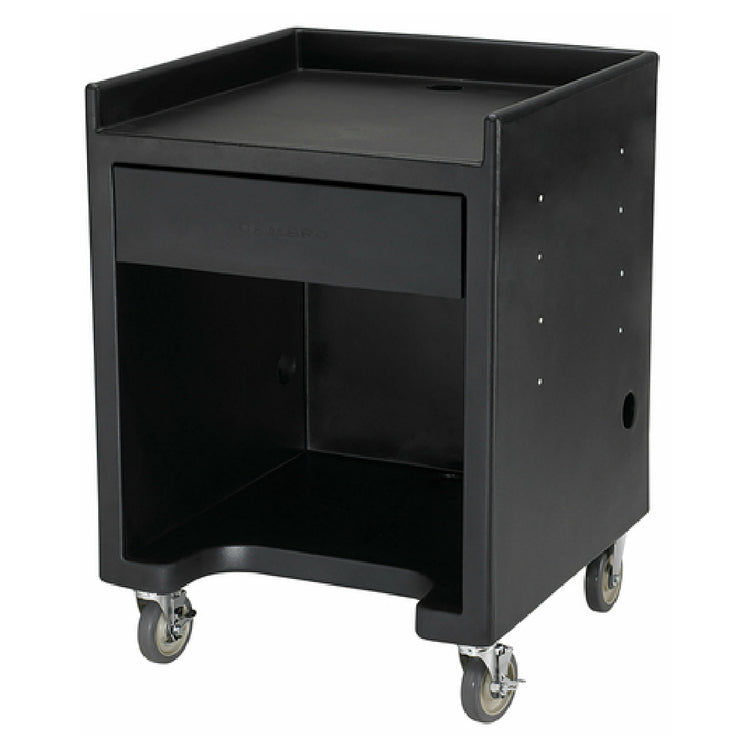 The Cambro ES28110 Equipment Stand Only is a robust and highly functional unit tailored for diverse operational needs within the food service industry. Measuring 28"W x 28"D x 39"H, this stand is crafted from durable polyethylene, ensuring a long-lasting performance under demanding conditions. It features four 5" casters - with two fixed and two swivel ones equipped with brakes - providing both stability and mobility, essential for dynamic kitchen environments. Its striking black color complements various kitchen aesthetics while maintaining ease of maintenance. The Cambro ES28110 is NSF certified, which underscores its compliance with rigorous public health and safety standards. This equipment stand is an ideal choice for restaurants, catering businesses, and other commercial food service settings that require reliable support for their kitchen equipment. Its thoughtful construction promotes efficiency and safety, making it an invaluable addition to any professional kitchen setup. By blending practicality with quality, the Cambro ES28110 Equipment Stand Only addresses the unique needs of a fast-paced culinary environment, ensuring that equipment remains accessible and secure during operation.