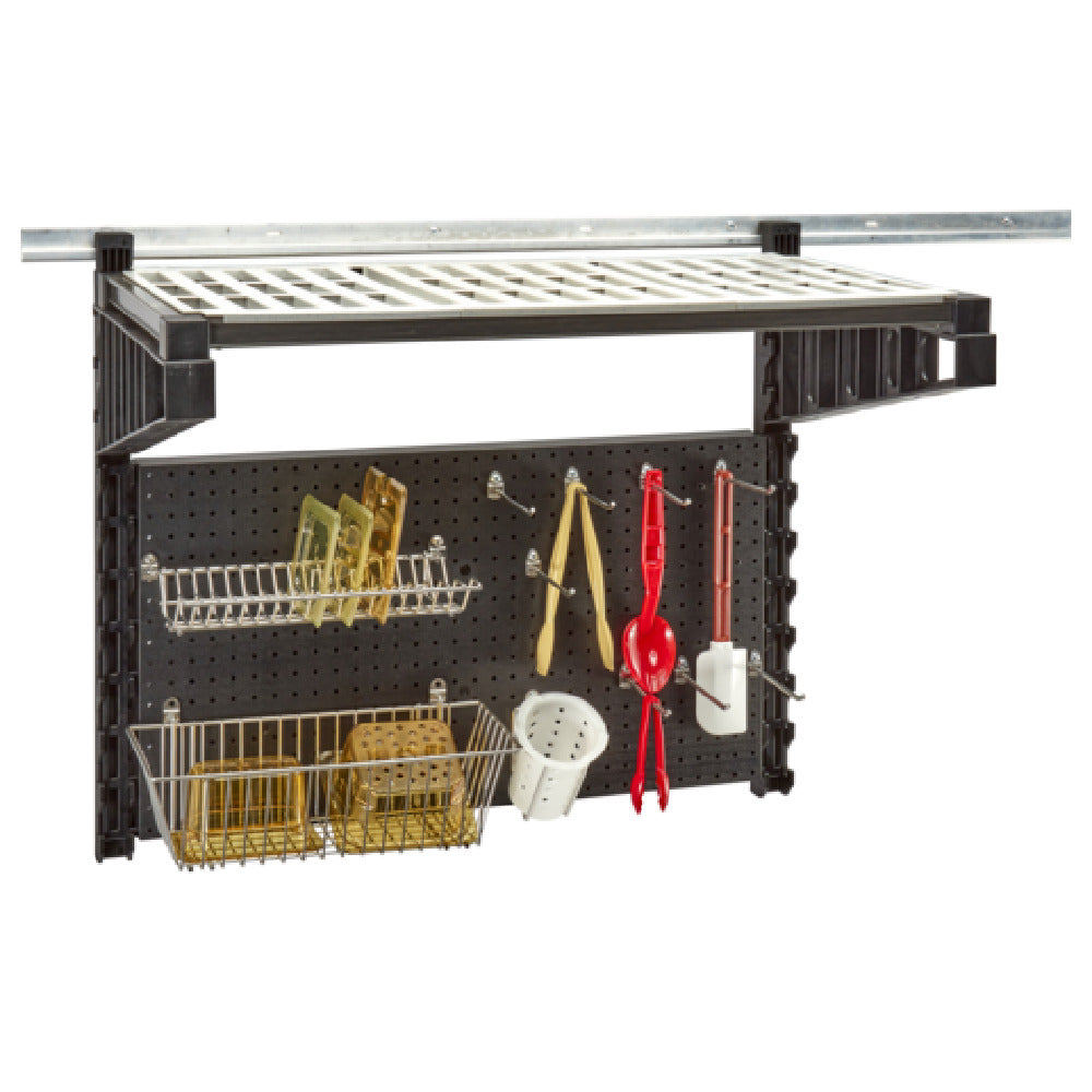 The Cambro EWS36SINK110 Camshelving® Elevation Series Wall Shelving Sink Station Starter Kit is a meticulously designed shelving solution, crafted to enhance the efficiency and functionality of any workspace, particularly in environments demanding high standards of hygiene and organization. Measuring 18 inches by 36 inches by 30-1/4 inches, this kit includes a 40-inch aluminum wall track and two 30-inch wall uprights, providing a sturdy and reliable mounting platform. It features two 18-inch deep universal shelf brackets and an 18-inch by 36-inch vented shelf, equipped with CamGuard® antimicrobial shelf plates to reduce bacterial growth. Additionally, the kit offers an 18-inch by 36-inch hanging pegboard, facilitating versatile storage options. Made with 304 stainless steel accessories, the kit includes a large wire basket, a small shelf/lid holder, a cylinder and holder, and a set of 6-inch peg hooks, all in a sleek black finish. Certified by NSF, this shelving system ensures compliance with health and safety standards, making it an ideal choice for industries such as catering, healthcare, and laboratory settings, where durability, sanitation, and adaptability are paramount. The Cambro EWS36SINK110 is a comprehensive and reliable solution for organized storage and efficient workspace management.