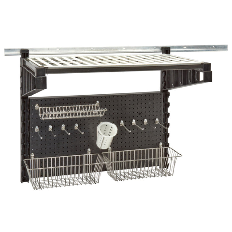The Cambro EWSA36PREP110 Camshelving® Elevation Series Wall Shelving Prep Station Add-On Kit is a versatile and practical storage solution designed for various professional environments. This kit features an 18" x 36" vented shelf, constructed with CamGuard® antimicrobial shelf plates, ensuring enhanced hygiene and safety standards. The package includes a 40" aluminum wall track and a 30" wall upright, providing sturdy support and easy installation. An 18" deep universal shelf bracket is also part of this kit, allowing for flexible shelf placement according to user needs. Additionally, the kit comprises an 18" x 36" hanging pegboard, offering ample space for organizing tools and accessories. The entire setup is finished in black and meets NSF certification requirements, ensuring compliance with public health and safety standards. This prep station add-on kit is tailored for commercial kitchens, restaurants, and other food service facilities that require efficient and sanitary storage solutions. Its robust construction and thoughtful design cater to a diverse range of industry needs, making it an invaluable component for optimizing workspace organization and functionality.